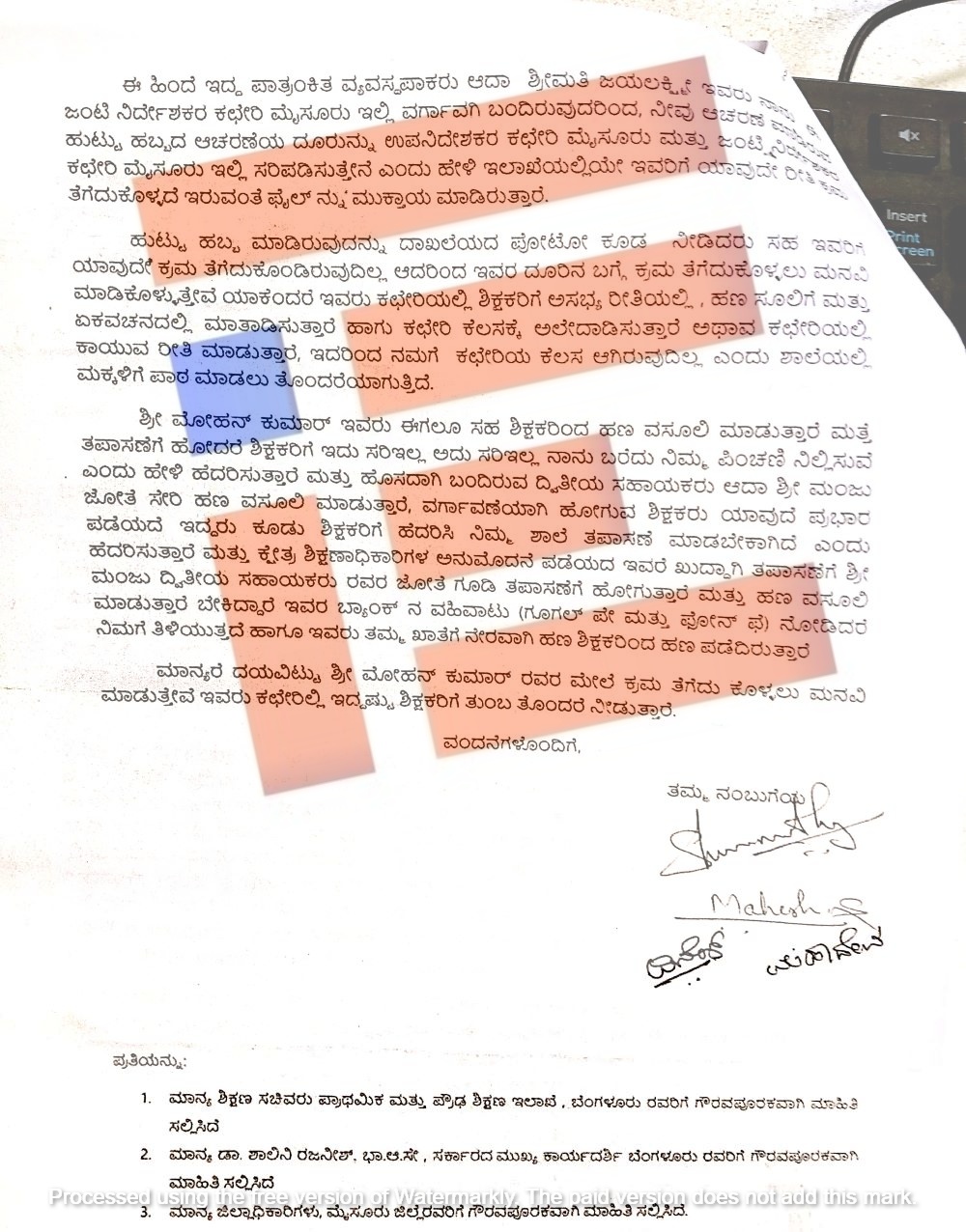 ವರ್ಗಾವಣೆಯಾಗಿ ಹೋಗುವ ಯಾವುದೇ ಶಿಕ್ಷಕರು ಪ್ರಭಾರ ಪಡೆಯದೇ ಇದ್ದರೂ ಸಹ ಅವರನ್ನು ಬೆದರಿಸಲಾಗುತ್ತಿದೆ. ‘ನಿಮ್ಮ ಶಾಲೆ ತಪಾಸಣೆ ಮಾಡಬೇಕಿದೆ’ ಎಂದು ಹೆದರಿಸುತ್ತಾರೆ. ಪ್ರಥಮದರ್ಜೆ ಗುಮಾಸ್ತ ಮೋಹನ್ ಕುಮಾರ್ ಅವರ ಜತೆ ಇದೇ ಕಚೇರಿಯ ದ್ವಿತೀಯ ದರ್ಜೆ ಸಹಾಯಕ ಮಂಜು ಎಂಬಾತ ಕೂಡ ಶಾಮೀಲಾಗಿದ್ದಾರೆ ಎಂದು ದೂರಿನಲ್ಲಿ ಹೇಳಲಾಗಿದೆ.