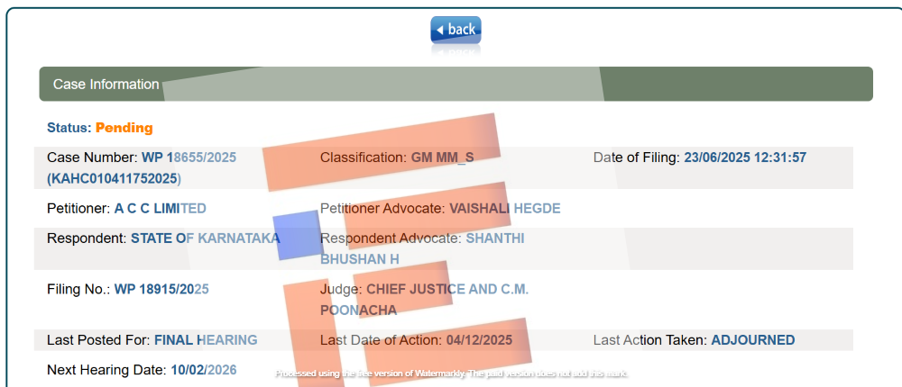 ಈ ಸಂಬಂಧವೂ ಎಸಿಸಿ ಲಿಮಿಟೆಡ್, ಉಚ್ಛ ನ್ಯಾಯಾಲಯದಲ್ಲಿ ರಿಟ್ ಅರ್ಜಿ (ಡಬ್ಲ್ಯೂ ಪಿ 25298/2024) ಸಲ್ಲಿಸಿದೆ. ಈ ಪ್ರಕರಣವು ಇನ್ನೂ ವಿಚಾರಣೆ ಹಂತದಲ್ಲಿದೆ ಎಂದು ಉನ್ನತ ಮಟ್ಟದ ಸಮಿತಿಯು ವರದಿಯಲ್ಲಿ ವಿವರಿಸಿರುವುದು ಗೊತ್ತಾಗಿದೆ.