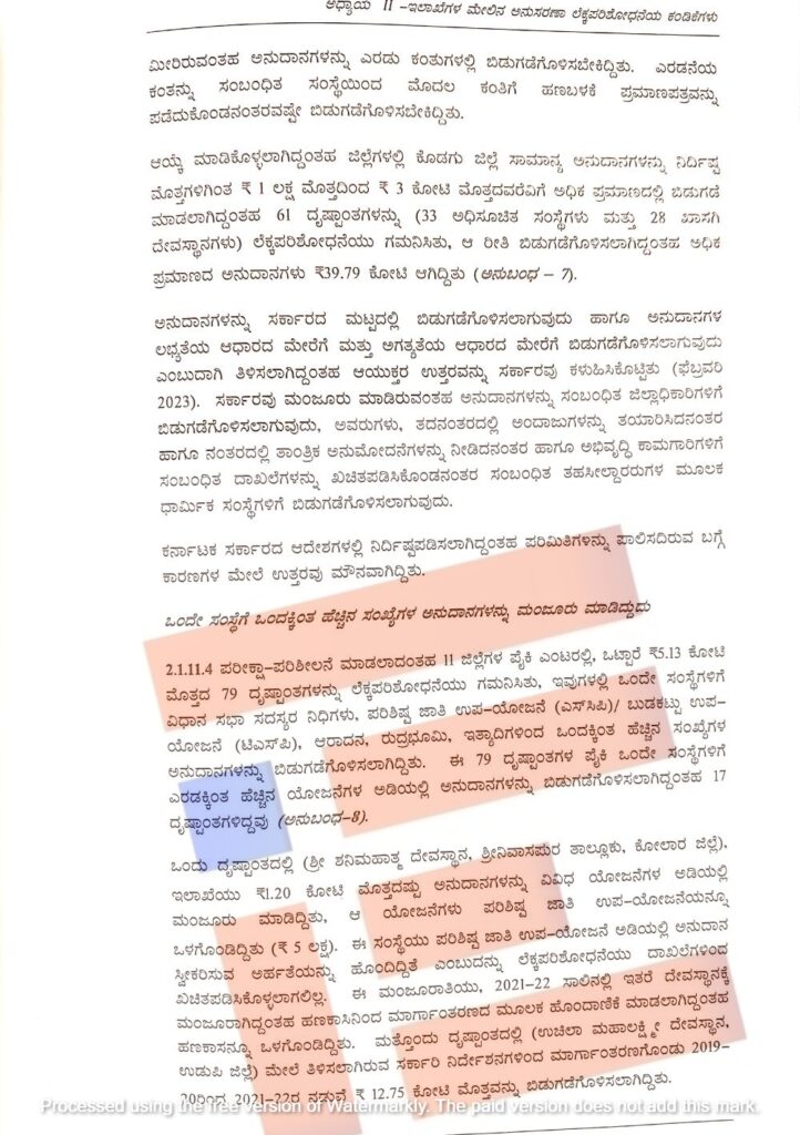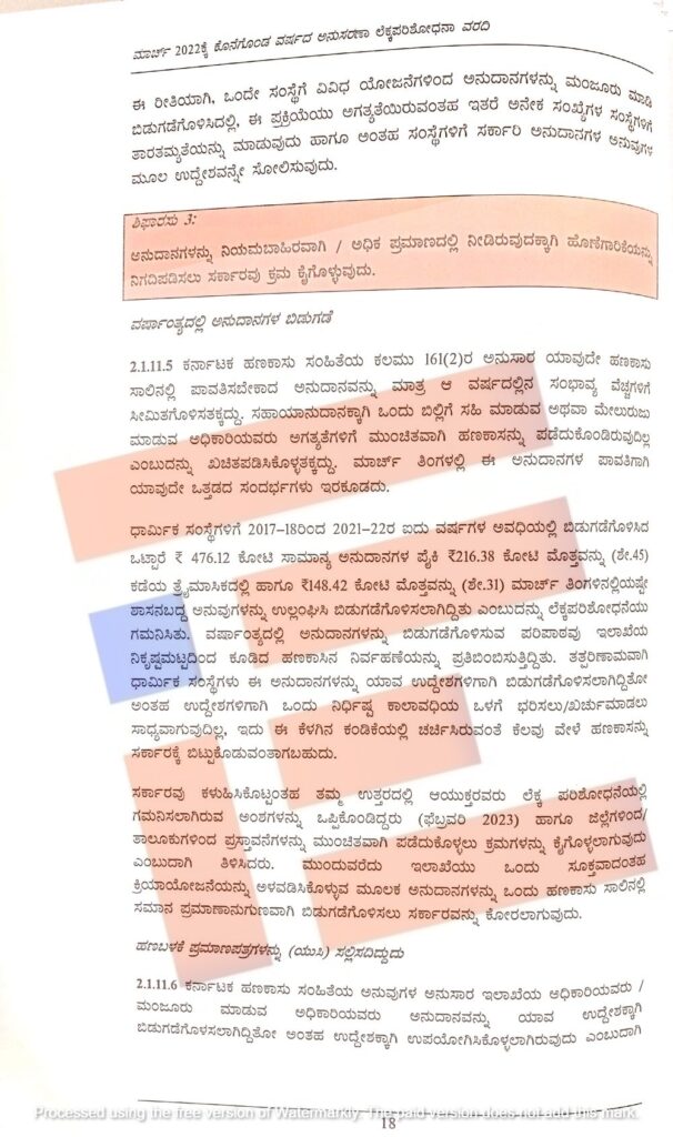 2017-18ರಿಂದ 2021-22ರ ಐದು ವರ್ಷಗಳ ಅವಧಿಯಲ್ಲಿ ಧಾರ್ಮಿಕ ಸಂಸ್ಥೆಗಳಿಗೆ 476.12 ಕೋಟಿ ರು ಬಿಡುಗಡೆ ಆಗಿತ್ತು. ಸಾಮಾನ್ಯ ಅನುದಾನಗಳ ಪೈಕಿ 2216 ಕೋಟಿ ರು. ಮೊತ್ತವನ್ನು ಕಡೆಯ ತ್ರೈಮಾಸಿಕದಲ್ಲಿ ಹಾಗೂ 148.42 ಕೋಟಿ ರು.ಗಳನ್ನು ಮಾರ್ಚ್ ತಿಂಗಳಿನಲ್ಲಷ್ಟೇ ಶಾಸನಬದ್ಧ ಅನುವುಗಳನ್ನು ಉಲ್ಲಂಘಿಸಿ ಬಿಡುಗಡೆ ಮಾಡಲಾಗಿತ್ತು ಎಂದು ಸಿಎಜಿ ವರದಿಯಲ್ಲಿ ವಿವರಿಸಲಾಗಿದೆ.