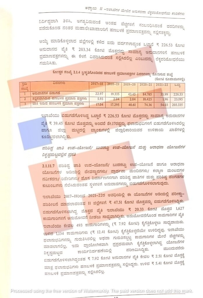 ಕಳೆದ 5 ವರ್ಷಗಳಲ್ಲಿ ಒಟ್ಟಾರೆ 226.53 ಕೋಟಿ ರು ಅನುದಾನ ಪೈಕಿ 203.34 ಕೋಟಿ ರು. ಮೊತ್ತದಷ್ಟು ಸಾಮಾನ್ಯ ಅನುದಾನಗಳಿಗೆ ಹಣ ಬಳಕೆ ಪ್ರಮಾಣ ಪತ್ರಗಳನ್ನು ಸಲ್ಲಿಸಿರಲಿಲ್ಲ. ಇಲಾಖೆಯು ಬಿಡುಗಡೆ ಮಾಡಿದ್ದ 226.53 ಕೋಟಿ ಮೊತ್ತದಷ್ಟು ಸಾಮಾನ್ಯ ಅನುದಾನಗಳ ಪೈಕಿ 39.45 ಕೊಟಿ ರು ಮೊತ್ತವನ್ನು ಅಂದರೇ ಶೆ.17ರಷ್ಟನ್ನು ಫಲಾನುಭವಿಗಳಿಗೆ ಬಿಡುಗಡೆ ಮಾಡಿರಲಿಲ್ಲ. ಹಾಗೂ ಜಿಲ್ಲಾ ಮಟ್ಟದಲ್ಲಿ ಬ್ಯಾಂಕ್ಗಳ್ಲಲಿ ಜಿಲ್ಲಾಧಿಕಾರಿಗಳ ಉಳಿತಾಯ ಖಾತೆಯಲ್ಲಿ ಕೂಡಿಟ್ಟಿತ್ತು ಎಂದು ಸಿಎಜಿ ವರದಿಯಿಂದ ತಿಳಿದು ಬಂದಿದೆ.