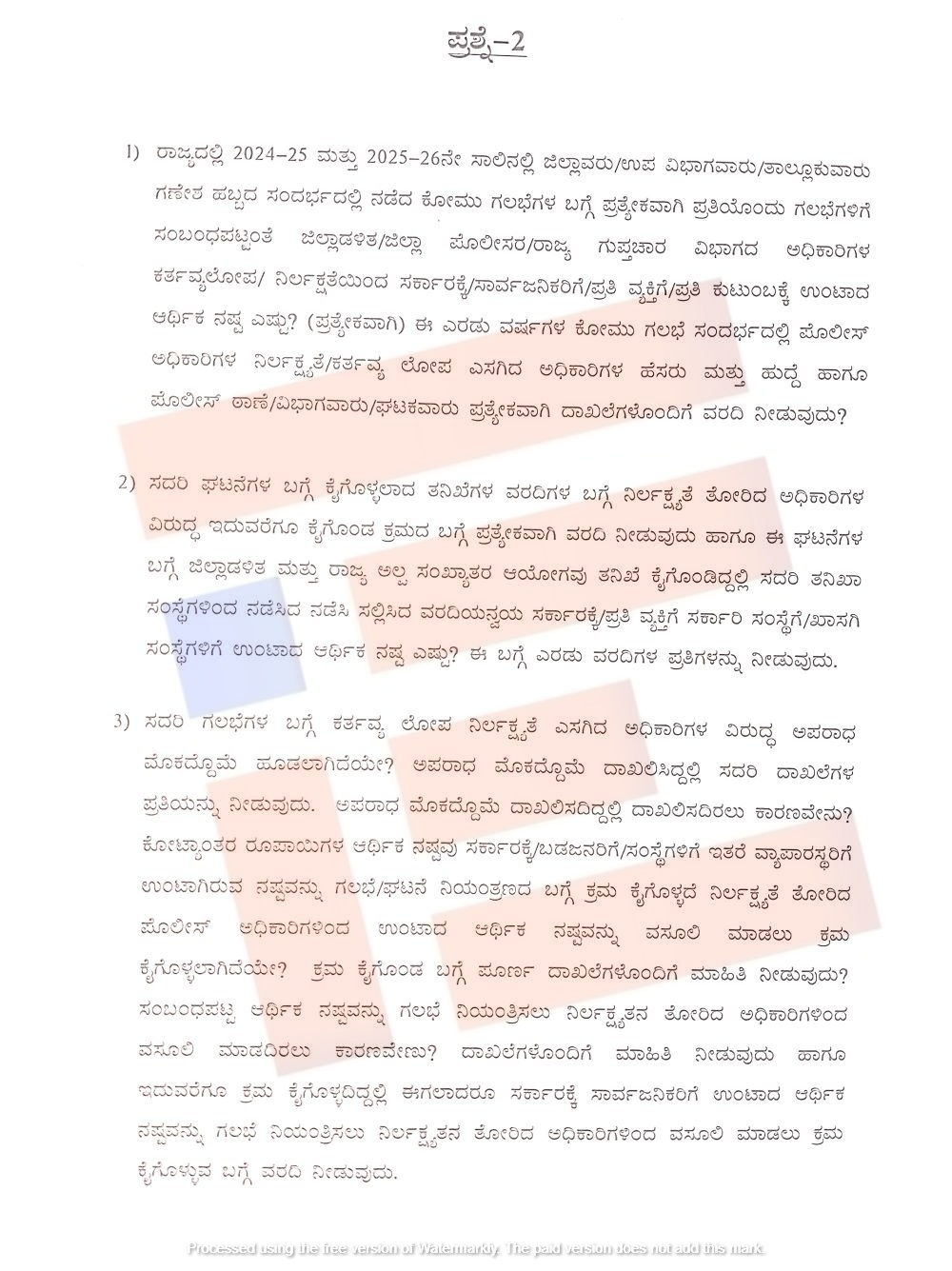 2024-25 ಮತ್ತು 2025-26ರ ಗಣೇಶ ಹಬ್ಬದ ಸಂದರ್ಭದಲ್ಲಿ ನಡೆದ ಕೋಮು ಗಲಭೆಗಳ ಬಗ್ಗೆ ಪ್ರತ್ಯೇಕವಾಗಿ ಪ್ರತಿಯೊಂದು ಗಲಭೆಗಳಿಗೆ ಸಂಬಂಧಪಟ್ಟಂತೆ ಜಿಲ್ಲಾಡಳಿತ/ಜಿಲ್ಲಾ ಪೊಲೀಸರ/ರಾಜ್ಯ ಗುಪ್ತಚರ ವಿಭಾಗದ ಅಧಿಕಾರಿಗಳ ಕರ್ತವ್ಯಲೋಪ/ ನಿರ್ಲಕ್ಷ್ಯತೆಯಿಂದ ಸರ್ಕಾರಕ್ಕೆ/ಸಾರ್ವಜನಿಕರಿಗೆ/ಪ್ರತಿ ವ್ಯಕ್ತಿಗೆ/ಪ್ರತಿ ಕುಟುಂಬಕ್ಕೆ ಉಂಟಾದ ಆರ್ಥಿಕ ನಷ್ಟ ಎಷ್ಟು, ಈ ಎರಡು ವರ್ಷಗಳ ಕೋಮು ಗಲಭೆ ಸಂದರ್ಭದಲ್ಲಿ ಪೊಲೀಸ್ ಅಧಿಕಾರಿಗಳ ನಿರ್ಲಕ್ಷ್ಯತೆ/ಕರ್ತವ್ಯ ಲೋಪ ಎಸಗಿದ ಅಧಿಕಾರಿಗಳ ಹೆಸರು ಮತ್ತು ಹುದ್ದೆ ಹಾಗೂ ಪೊಲೀಸ್ ಠಾಣೆ/ವಿಭಾಗವಾರು/ಘಟಕವಾರು ಪ್ರತ್ಯೇಕವಾಗಿ ದಾಖಲೆಗಳೊಂದಿಗೆ ವರದಿ ನೀಡಬೇಕು ಎಂದು ಕೋರಿದ್ದರು.