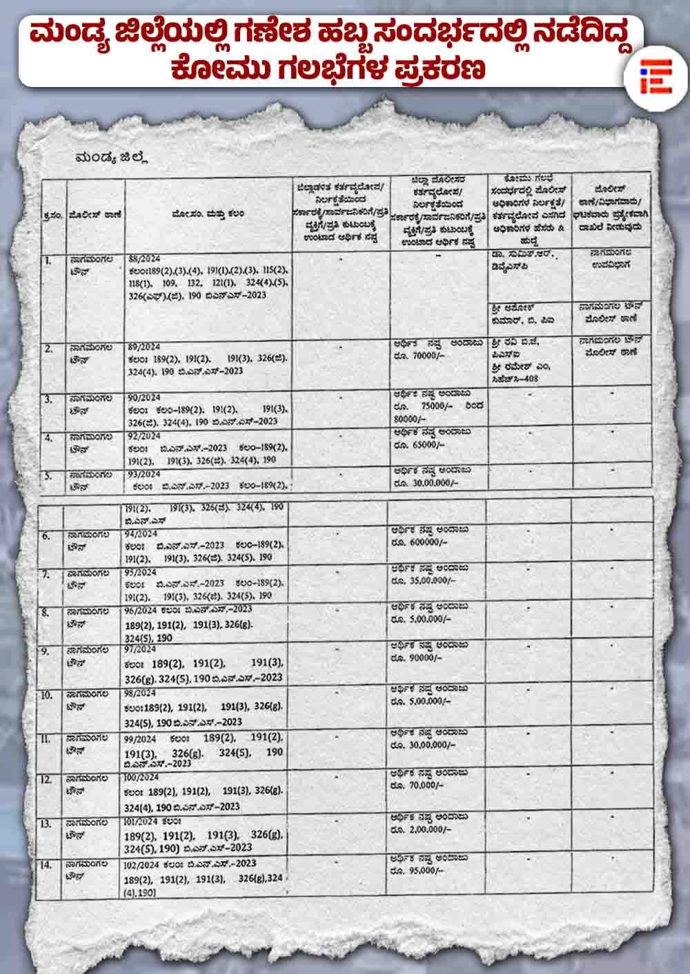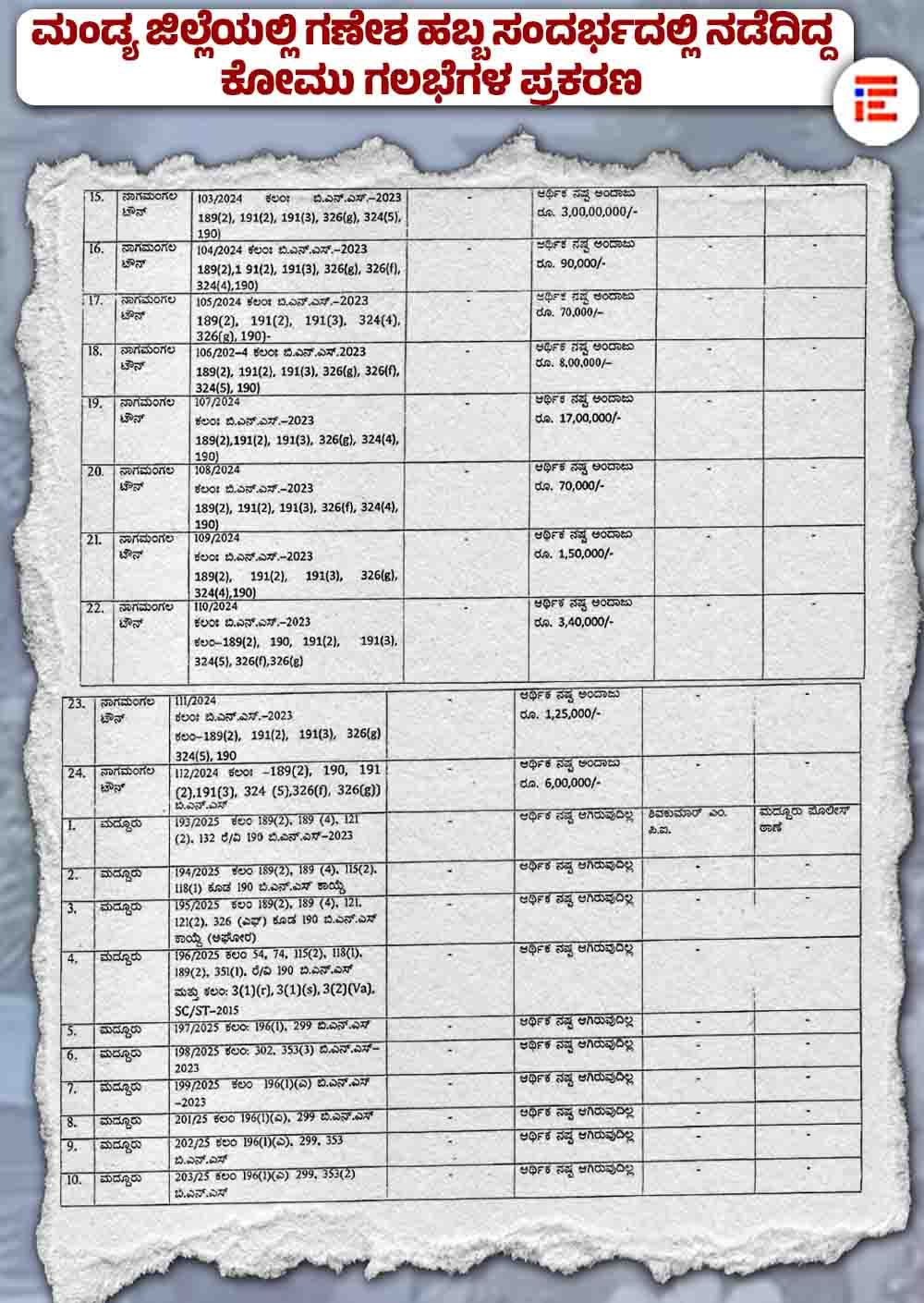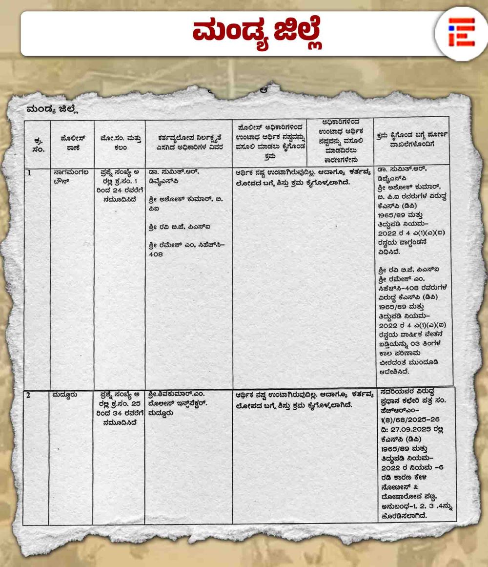 ನಾಗಮಂಗಲ ಟೌನ್ನಲ್ಲಿ 2024 ಮತ್ತು 2025ನೇ ಸಾಲಿನಲ್ಲಿ ಗಣೇಶ ಹಬ್ಬದ ಸಂದರ್ಭದಲ್ಲಿ ನಡದಿದ್ದ ಕೋಮು ಗಲಭೆ ಪ್ರಕರಣಗಳಲ್ಲಿ ಡಿವೈಎಸ್ಪಿ ಡಾ ಸುಮಿತ್ ಆರ್ ಪೊಲೀಸ್ ಇನ್ಸ್ಪೆಕ್ಟರ್ ಅಶೋಕ್ಕುಮಾರ್, ಪಿಎಸ್ಐ ರವಿ ಬಿ ಜೆ, ಹೆಡ್ ಕಾನ್ಸ್ಟೆಬಲ್ ರಮೇಶ್ ಎಂಬ ಅವರ ಕರ್ತವ್ಯ ನಿರ್ಲಕ್ಷ್ಯ, ಕರ್ತವ್ಯ ಲೋಪ ಎಸಗಿದ್ದಾರೆ ಎಂದು ಮಾಹಿತಿ ನೀಡಿದ್ದಾರೆ. ಇವರ ನಿರ್ಲಕ್ಷ್ಯ ಮತ್ತು ಲೋಪದಿಂದಾಗಿ ಒಟ್ಟಾರೆ 4,56,45,000 ರು ನಷ್ಟವಾಗಿದೆ.