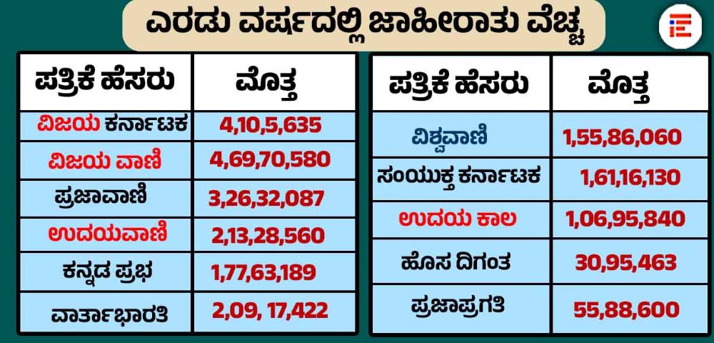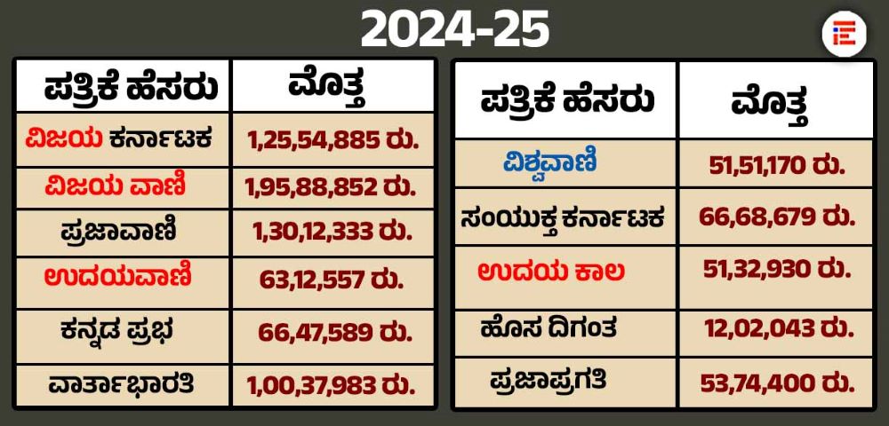 ಒಟ್ಟಾರೆ 2024-25ನೇ ಸಾಲಿನಲ್ಲಿ ಒಟ್ಟು 15 ರಾಜ್ಯಮಟ್ಟದ ದಿನ ಪತ್ರಿಕೆಗಳಿಗೆ 8,85,19,860 ರು. ಮೌಲ್ಯದ ಜಾಹೀರಾತು ನೀಡಲಾಗಿದೆ. ಉಳಿದ ಮೊತ್ತವನ್ನು ನೇರವಾಗಿ ವಿಶೇಷ ಸಂಚಿಕೆ, ಪ್ರಾಯೋಜಿತ ವರದಿ ಮತ್ತು ಕಾರ್ಯಕ್ರಮಗಳಿಗಾಗಿ ನೇರವಾಗಿ ಪತ್ರಿಕಾ ಸಂಸ್ಥೆಗೆ ಪಾವತಿಸಿದೆ. 2023-24ನೇ ಸಾಲಿನಲ್ಲಿ ವಿಜಯ ಕರ್ನಾಟಕ ಪತ್ರಿಕೆಗೆ ಜಾಹೀರಾತು ಮೊತ್ತವಾಗಿ 2, 27,78,150 ರು.ಗಳನ್ನು ಪಾವತಿಸಲಾಗಿದೆ. ಅಲ್ಲದೆ, ಹೆಚ್ಚುವರಿಯಾಗಿ 57,72,609 ರು.ಗಳನ್ನು ನೇರವಾಗಿ ಈ ಪತ್ರಿಕಾ ಸಂಸ್ಥೆಗೆ ನೀಡಲಾಗಿದೆ.