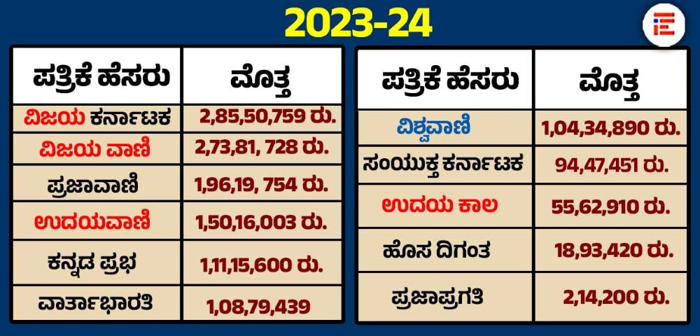ಒಟ್ಟಾರೆ 2023-24ನೇ ಸಾಲಿನಲ್ಲಿ ಒಟ್ಟು 14 ರಾಜ್ಯಮಟ್ಟದ ದಿನ ಪತ್ರಿಕೆಗಳಿಗೆ 16,14,57,232 ರು. ಮೌಲ್ಯದ ಜಾಹೀರಾತು ನೀಡಲಾಗಿದೆ. ಇದರಲ್ಲಿ ನಾಲ್ಕು ಇಂಗ್ಲಿಷ್ ಪತ್ರಿಕೆಗಳೂ ಸೇರಿವೆ. ಕೇವಲ ಪತ್ರಿಕೆಯಲ್ಲಿ ಪ್ರಕಟವಾಗುವ ಜಾಹೀರಾತು ಮಾತ್ರವಲ್ಲದೆ, ಪ್ರಾಯೋಜಿತ ವರದಿ, ವಿಶೇಷ ಸಂಚಿಕೆ ಮತ್ತು ಕಾರ್ಯಕ್ರಮಗಳಿಗೂ ರಾಜ್ಯ ಸರ್ಕಾರ ಈ ಪತ್ರಿಕಾ ಸಂಸ್ಥೆಗಳಿಗೆ ಹಣ ನೀಡಿದೆ.