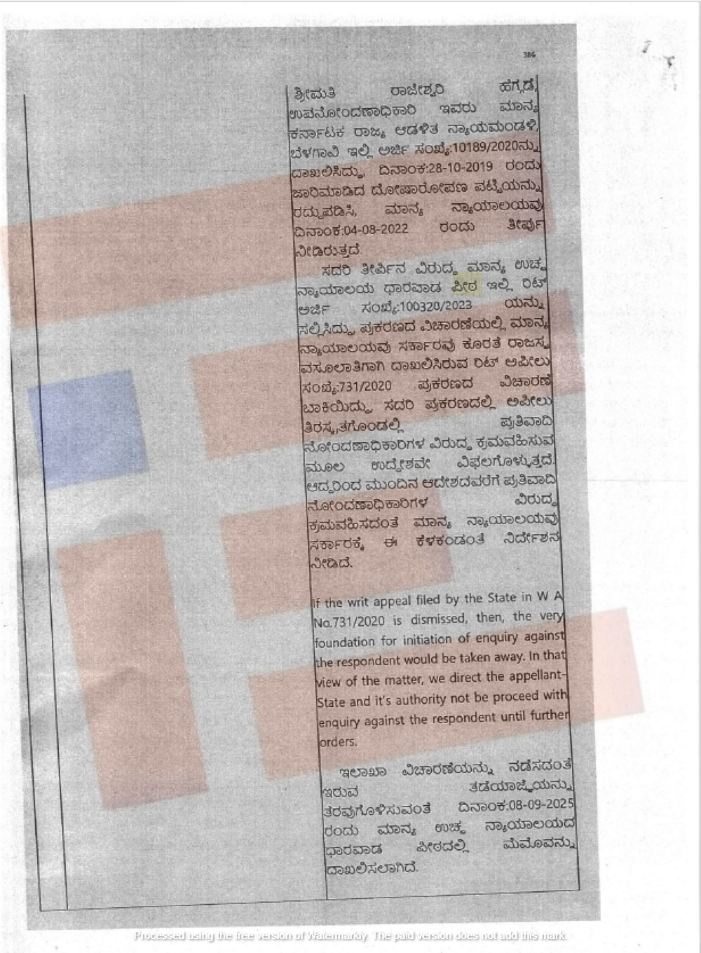 ಇಲಾಖೆ ವಿಚಾರಣೆಯನ್ನು ನಡೆಸದಂತೆ ಇರುವ ತಡೆಯಾಜ್ಞೆಯನ್ನು ತೆರವುಗೊಳಿಸುವಂತೆ 2025ರಂದು ಉಚ್ಛ ನ್ಯಾಯಾಲಯದ ಧಾರವಾಡ ಪೀಠದಲ್ಲಿ ಮೆಮೋ ದಾಖಲಿಸಲಾಗಿದೆ. ಪ್ರಕರಣಖವು ನ್ಯಾಯಾಲಯದಲ್ಲಿ ಬಾಕಿ ಇದ್ದು ದಸ್ತಾವೇಜುಗಳ ನೋಂದಣಿ ರದ್ದುಪಡಿಸಲು ಕಾನೂನಿನಲ್ಲಿ ಅವಕಾಶವಿಲ್ಲ ಎಂದು ಉತ್ತರದಲ್ಲಿ ತಿಳಿಸಿದ್ದಾರೆ.