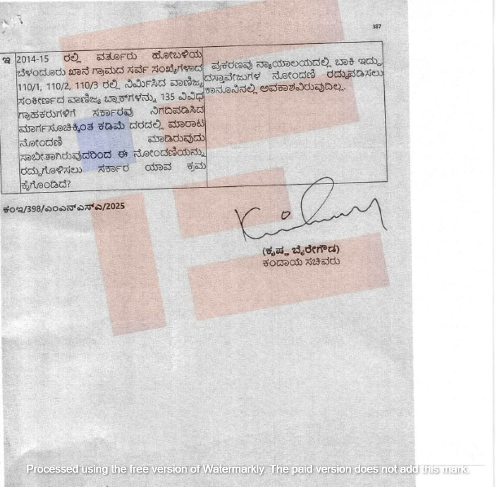 2014-15ರಲ್ಲಿ ವರ್ತೂರು ಹೋಬಳಿಯ ವರ್ತೂರು ಹೋಬಳಿಯಿಂದ ಬೆಳಂದೂರು ಖಾನೆ ಗ್ರಾಮದ ಸರ್ವೇ ನಂಬರ್ಗಳಾದ 110/1, 110/2, 110/3ರಲ್ಲಿ ನಿರ್ಮಿಸಿದ್ದ ವಾಣಿಜ್ಯ ಸಂಕೀರ್ಣದ ವಾಣಿಜ್ಯ ಬ್ಲಾಕ್ಗಳನ್ನು 135 ವಿವಿಧ ಗ್ರಾಹಕರುಗಳಿಗೆ ಸರ್ಕಾರ ನಿಗದಿಪಡಿಸಿದ ಮಾರ್ಗಸೂಚಿ ದರಕ್ಕಿಂತ ಕಡಿಮೆ ದರದಲ್ಲಿ ಮಾರಾಟ ನೋಂದಣಿ ಮಾಡಿರುವುದು ಸಾಬೀತಾಗಿರುವುದಿರಂದ ಈ ನೋಂದಣಿಯನ್ನು ರದ್ದುಗೊಳಿಸಲು ಸರ್ಕಾರ ಯಾವ ಕ್ರಮ ಕೈಗೊಂಡಿದೆ ಎಂಬ ಮಾಹಿತಿ ಕೋರಿದ್ದಾರೆ.