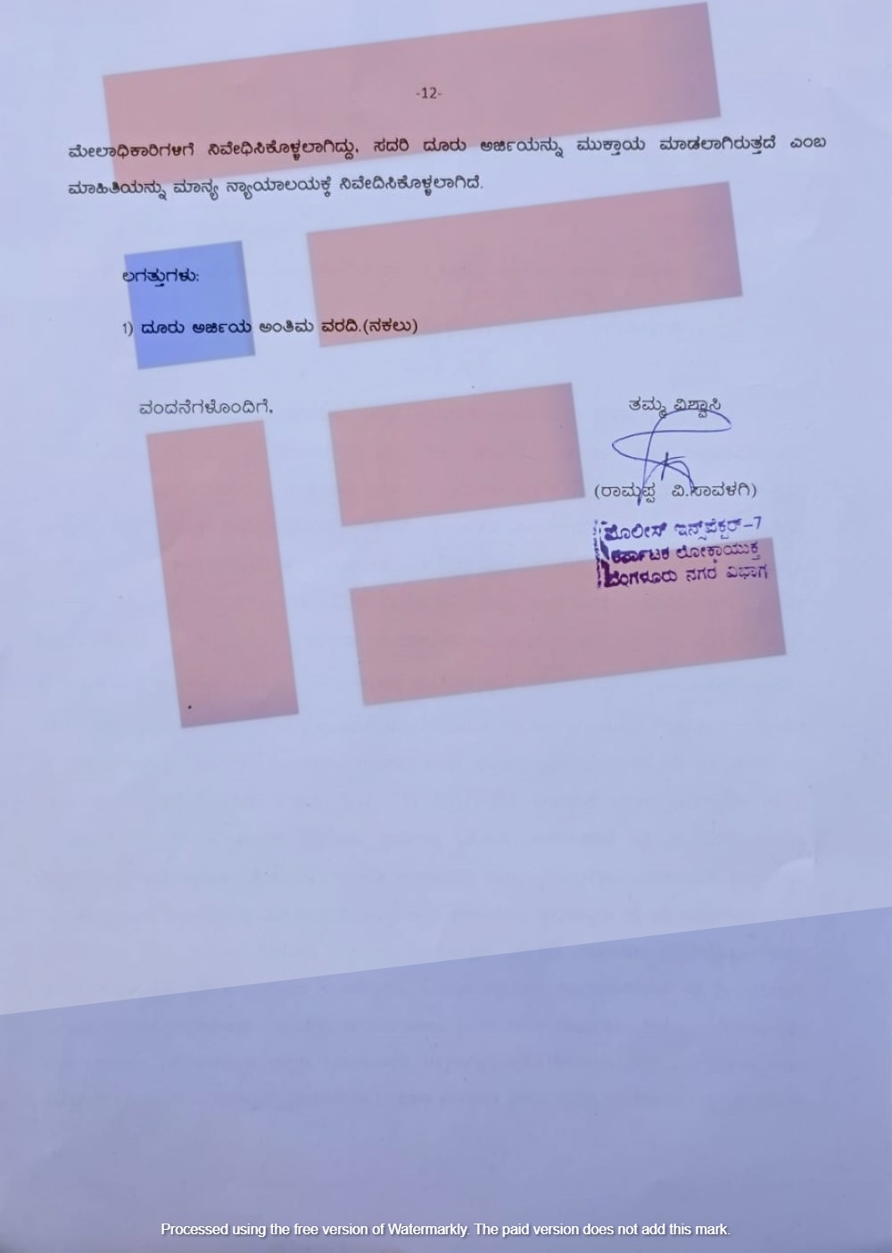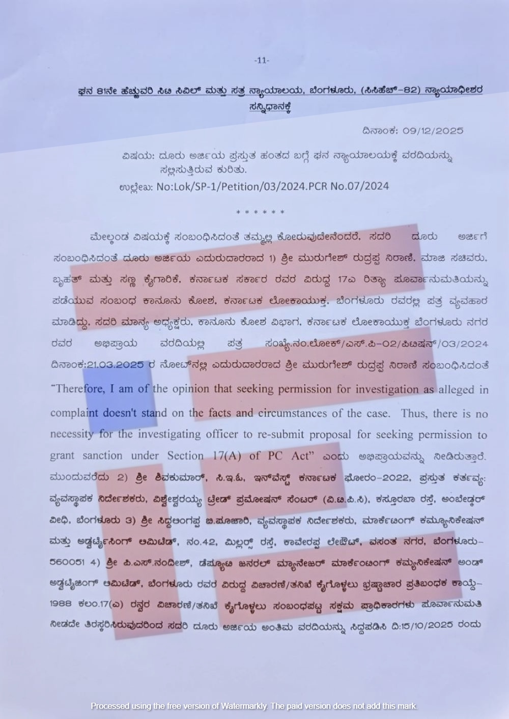 ಈ ಸಂಬಂಧ ಲೋಕಾಯುಕ್ತ ಪೊಲೀಸ್ ಇನ್ಸ್ಪೆಕ್ಟರ್ ರಾಮಪ್ಪ ವಿ ಸಾವಳಗಿ ಅವರು 8ನೇ ಹೆಚ್ಚುವರಿ ಸಿಟಿ ಸಿವಿಲ್ ಮತ್ತು ಸತ್ರ ನ್ಯಾಯಾಲಯದ ನ್ಯಾಯಾಧೀಶರಿಗೆ 2025ರ ಡಿಸೆಂಬರ್ 9ರಂದು ವರದಿ ಸಲ್ಲಿಸಿದ್ದಾರೆ. ನ್ಯಾಯಾಲಯಕ್ಕೆ ಸಲ್ಲಿಸಿರುವ ವರದಿಯ ಪ್ರತಿಯು ‘ದಿ ಫೈಲ್’ಗೆ ಲಭ್ಯವಾಗಿದೆ.