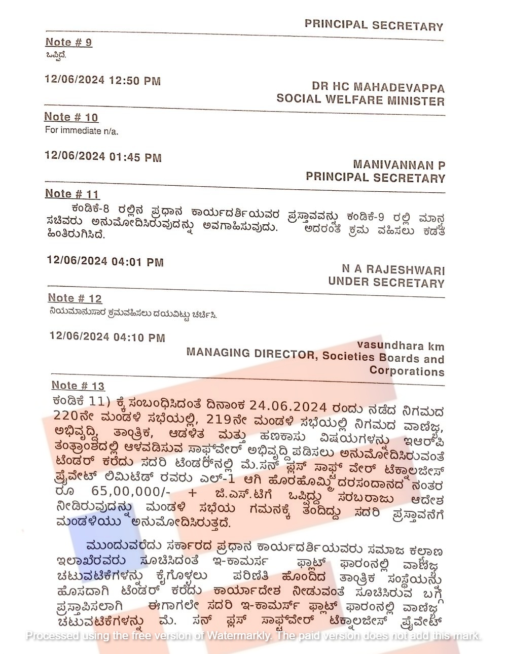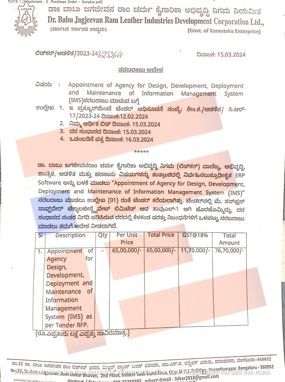 ಈ ಟೆಂಡರ್ನಲ್ಲಿ ಭಾಗವಹಿಸಿದ್ದ ಕಂಪನಿಗಳ ಪೈಕಿ ಸನ್ ಪ್ಲಸ್ ಸಾಫ್ಟ್ವೇರ್ ಟೆಕ್ನಾಲಜೀಸ್ ಪ್ರೈ ಜಿಎಸ್ಟಿ ಒಳಗೊಂಡಂತೆ ನಮೂದಿಸಿದ್ದ ದರದೊಂದಿಗೆ ಸಂಧಾನ ನಡೆಸಿದ ನಂತರ 65.00 ಲಕ್ಷ ರು.ಗೆ ಒಪ್ಪಿತ್ತು. ಭಾಗವಹಿಸಿದ್ದ ಇತರೆ ಕಂಪನಿಗಳಿಗೆ ಹೋಲಿಸಿದರೆ ಸನ್ ಪ್ಲಸ್ ಸಾಫ್ಟ್ವೇರ್ ಟೆಕ್ನಾಲಜೀಸ್ ಪ್ರೈ ಲಿಮಿಟೆಡ್ ಕಡಿಮೆ ದರ ನಮೂದಿಸಿದ್ದ ಕಾರಣ ಟೆಂಡರ್ನಲ್ಲಿ ಎಲ್ 1 ಆಗಿ ಹೊರಹೊಮ್ಮಿತ್ತು.