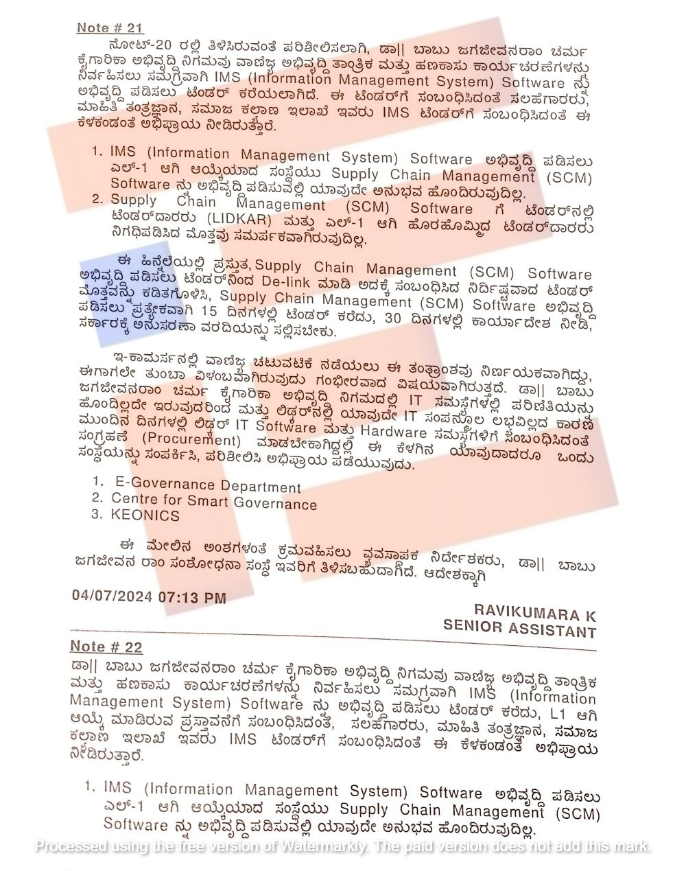 ‘ಐಎಂಎಸ್ ಸಾಫ್ಟ್ವೇರ್ ಅಭಿವೃದ್ಧಿಪಡಿಸಲು ಎಲ್ 1 ಆಗಿ ಆಯ್ಕೆಯಾದ ಸಂಸ್ಥೆಯು ಸಪ್ಲೈ ಚೈನ್ ಮ್ಯಾನೇಜ್ಮೆಂಟ್ (SCM) ಅಭಿವೃದ್ಧಿಪಡಿಸುವಲ್ಲಿ ಯಾವುದೇ ಅನುಭವ ಹೊಂದಿರುವುದಿಲ್ಲ. ಅಲ್ಲದೇ ಎಸ್ಸಿಎಂ ಗೆ ಟೆಂಡರ್ನಲ್ಲಿ ಟೆಂಡರ್ದಾರರು ಮತ್ತು ಎಲ್-1 ಆಗಿ ಹೊರಹೊಮ್ಮಿದ ಟೆಂಡರ್ದಾರರು ನಿಗದಿಪಡಿಸಿದ ಮೊತ್ತವೂ ಸಮರ್ಪಕವಾಗಿರುವುದಿಲ್ಲ,’ ಎಂದು ಇಲಾಖೆಯ ಐಟಿ ಸಲಹೆಗಾರರು ಅಭಿಪ್ರಾಯ ನೀಡಿದ್ದರು ಎಂಬುದು ತಿಳಿದು ಬಂದಿದೆ.