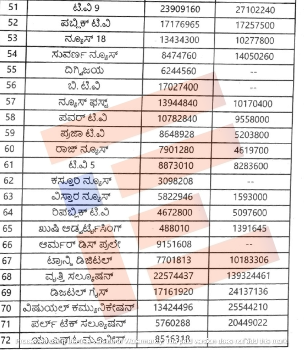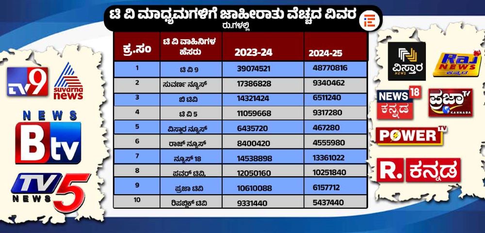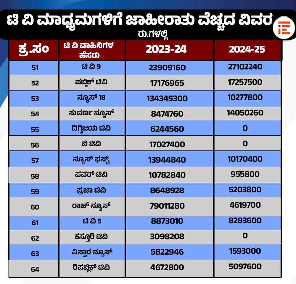ʻಟಿವಿ 9ʼ ಸಂಸ್ಥೆಗೆ 2023-24ನೇ ಸಾಲಿನಲ್ಲಿ 6.29 ಕೋಟಿ ರು.ಗಳನ್ನು ( 6,29,83,681 ರು.) ನೀಡಲಾಗಿದ್ದರೆ, 2024-25ನೇ ಸಾಲಿನಲ್ಲಿ ಇದಕ್ಕಿಂತ ಹೆಚ್ಚು ಅಂದರೆ 7.58 ಕೋಟಿ ರು.ಗಳನ್ನು ( 7,58,73,056 ರು.) ನೀಡಲಾಗಿದೆ. ಪತ್ರಕರ್ತ ರಂಗನಾಥ್ ನೇತೃತ್ವದ ʻಪಬ್ಲಿಕ್ ಟಿವಿʼ 2023-24ನೇ ಸಾಲಿನಲ್ಲಿ 3.78 ಕೋಟಿ ರು.ಗಳ ( 3,78,62,955 ರು.) ಸರ್ಕಾರಿ ಜಾಹೀರಾತು ಪಡೆದುಕೊಂಡಿದ್ದರೆ, 2024-25ನೇ ಸಾಲಿನಲ್ಲಿ 3.38 ಕೋಟಿ ರು.ಗಳ (3,38,55, 380 ರು.) ಗಳ ಜಾಹೀರಾತು ಪಡೆದುಕೊಂಡಿದೆ.
