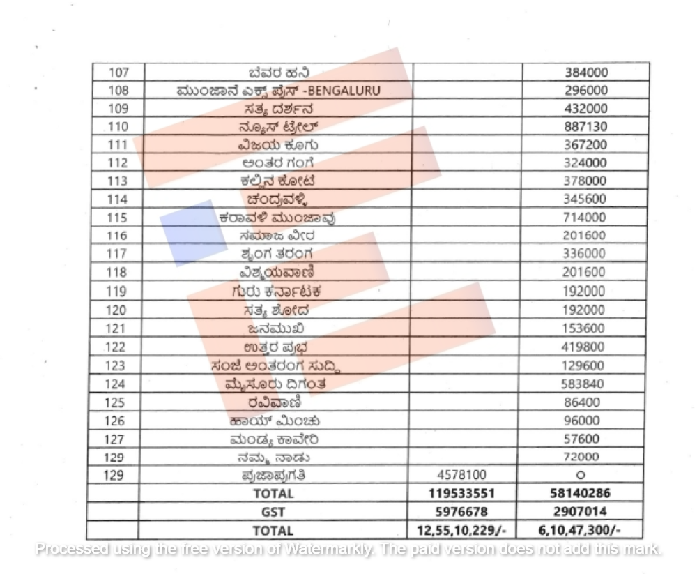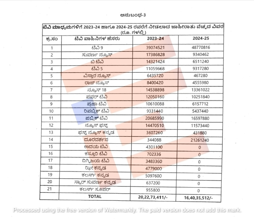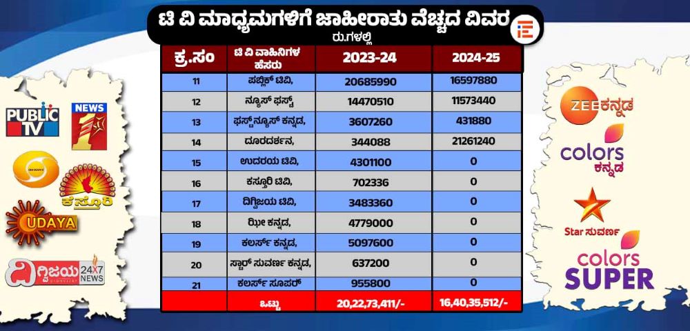 ರಾಜ್ಯದಲ್ಲಿ ಪ್ರಸಾರವಾಗುತ್ತಿರುವ ಒಟ್ಟು 21 ಟಿವಿಗಳಿಗೆ ಜಾಹೀರಾತು ನೀಡಲು 2023-24ನೇ ಸಾಲಿನಲ್ಲಿ 20.22 ಕೋಟಿ ರು. (20,22,73,411 ರು.) ನೀಡಲಾಗಿದ್ದರೆ, 2024-25ನೇ ಸಾಲಿನಲ್ಲಿ ಕೇವಲ 14 ಟಿವಿಗಳಿಗೆ 16.40 ಕೋಟಿ ರು. (16,10,35,512ರು.) ಜಾಹೀರಾತು ನೀಡಲಾಗಿದೆ. ಎರಡು ವರ್ಷಗಳಲ್ಲಿ ಒಟ್ಟು 36.63 ಕೋಟಿ.ರು.ಗಳ ಜಾಹೀರಾತು ನೀಡಲಾಗಿದೆ.