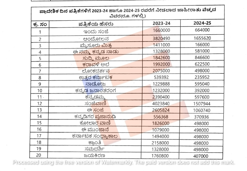 ಪ್ರಾದೇಶಿಕ ಪತ್ರಿಕೆಗಳಿಗೆ 2023-24ನೇ ಸಾಲಿನಲ್ಲಿ ಸರ್ಕಾರ ಒಟ್ಟು 12.55 ಕೋಟಿ ರು.ಗಳ (12,55,10,2291 ರು.) ಜಾಹೀರಾತು ನೀಡಿತ್ತು. ಆದರೆ 2024-25ನೇ ಸಾಲಿನಲ್ಲಿ ಈ ಮೊತ್ತ ಅರ್ಧದಷ್ಟು ಕಡಿಮೆಯಾಗಿತ್ತು. 2024-25ನೇ ಸಾಲಿನಲ್ಲಿ 122 ಪತ್ರಿಕೆಗಳಿಗೆ ಜಾಹೀರಾತು ನೀಡಲಾಗಿದೆಯಾದರೂ ಅವುಗಳ ಒಟ್ಟು ಮೊತ್ತ 6.10 ಕೋಟಿ ರು. (6,10,47,300 ರು.) ಮಾತ್ರ.