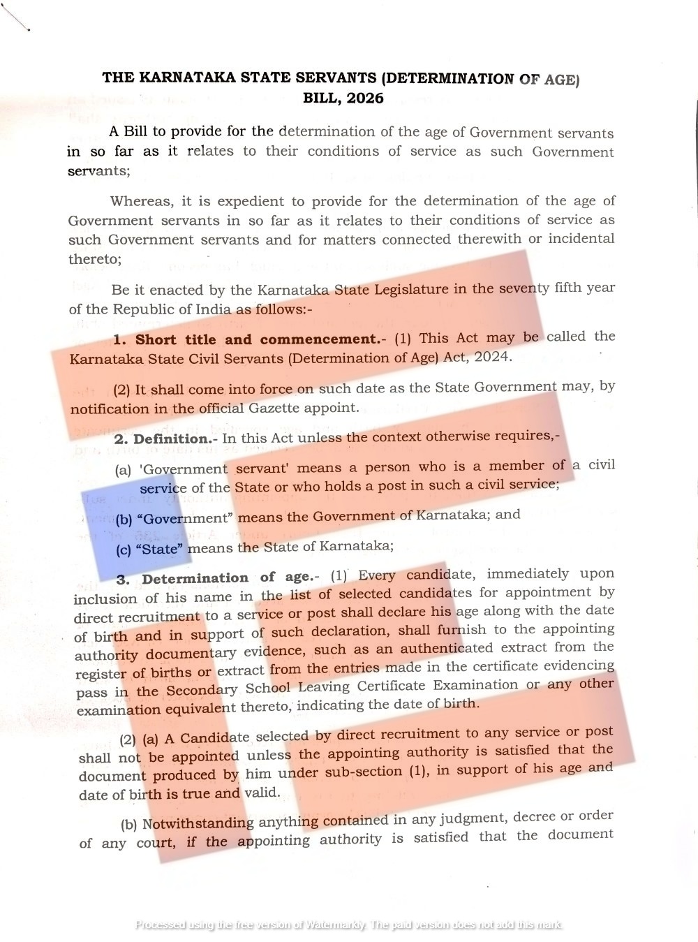 ಕರ್ನಾಟಕ ರಾಜ್ಯ ನೌಕರರ ವಯಸ್ಸನ್ನು ಖಚಿತಪಡಿಸಿಕೊಳ್ಳುವ ವಿಧೇಯಕ 2026ರ ಕರಡು ಪ್ರತಿಯು ‘ದಿ ಫೈಲ್’ಗೆ ಲಭ್ಯವಾಗಿದೆ.