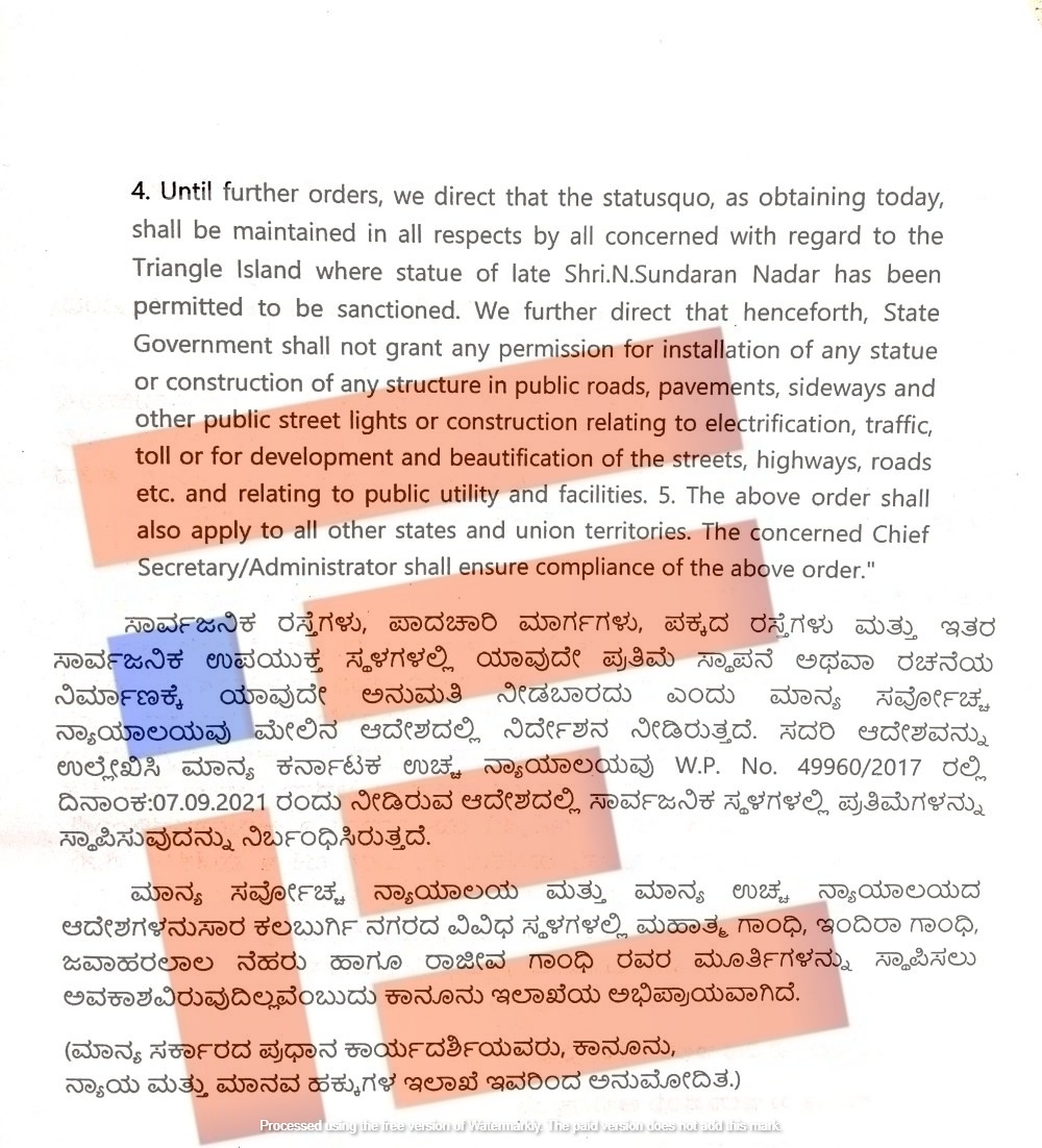 ಸಾರ್ವಜನಿಕ ರಸ್ತೆಗಳು, ಪಾದಚಾರಿ ಮಾರ್ಗಗಳು, ಪಕ್ಕದ ರಸ್ತೆಗಳು ಮತ್ತು ಇತರ ಸಾರ್ವಜನಿಕ ಉಪಯುಕ್ತ ಸ್ಥಳಗಳಲ್ಲಿ ಯಾವುದೇ ಪ್ರತಿಮೆ ಸ್ಥಾಪನೆ ಅಥವಾ ರಚನೆಯ ನಿರ್ಮಾಣಕ್ಕೆ ಯಾವುದೇ ಅನುಮತಿ ನೀಡಬಾರದು ಎಂದು ಸರ್ವೋಚ್ಛ ನ್ಯಾಯಾಲಯವು ವಿಶೇಷ ಅರ್ಜಿ (ಸಿವಿಲ್ ಸಂಖ್ಯೆ; 8519/2006, ದಿನಾಂಕ 18.01.2013, ಮಧ್ಯಂತರ ಅರ್ಜಿ 10/2012) ರಲ್ಲಿ ನೀಡಿರುವ ಆದೇಶವನ್ನು ಉಲ್ಲೇಖಿಸಿದೆ.