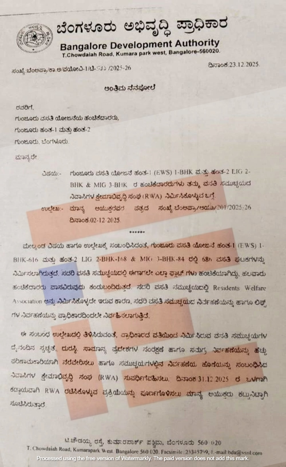 ಗುಂಜೂರು ವಸತಿ ಯೋಜನೆ ಹಂಚಿಕೆದಾರರಿಗೆ ಬೆಂಗಳೂರು ಅಭಿವೃದ್ಧಿ ಪ್ರಾಧಿಕಾರವು 2025ರ ಡಿಸೆಂಬರ್‍‌ 23ರಂದು ಜಾರಿಗೊಳಿಸಿರುವ ಅಂತಿಮ ನೆನಪೋಲೆಯ ಪ್ರತಿಯು ‘ದಿ ಫೈಲ್‌’ಗೆ ಲಭ್ಯವಾಗಿದೆ.