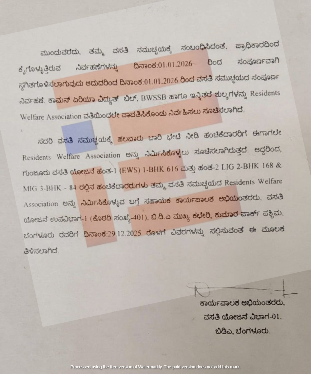 ವಸತಿ ಸಮುಚ್ಛಯಕ್ಕೆ ಸಂಬಂಧಿಸಿದಂತೆ ಪ್ರಾಧಿಕಾರದಿಂದ ಕೈಗೊಳ್ಳುವ ನಿರ್ವಹಣೆಗಳಣ್ನು 2026ರ ಜನವರಿ 1ರಿಂದ ಸಂಪೂರ್ಣವಾಗಿ ಸ್ಥಗಿತಗೊಳಿಸಲಾಗುವುದು. ಅಲ್ಲದೇ 2026ರ ಜನವರಿ 1ರಿಂದಲೇ ವಸತಿ ಸಮುಚ್ಛಯದ ಸಂಪೂರ್ಣ ನಿರ್ವಹಣೆ, ಕಾಮನ್‌ ಏರಿಯಾ ವಿದ್ಯುತ್‌ ಬಿಲ್‌, ಬಿಡಬ್ಲ್ಯೂಎಸ್‌ಎಸ್‌ಬಿ ಇನ್ನಿತರೆ ಶುಲ್ಕಗಳನ್ನು ನಿವಾಸಿಗಳ ಕ್ಷೇಮಾಭಿವೃದ್ಧಿ ಸಂಘದಿಂದಲೇ ಪಾವತಿಸಿ ನಿರ್ವಹಿಸಬೇಕು ಎಂದು ನೆನಪೋಲೆಯಲ್ಲಿ ಸೂಚಿಸಿರುವುದು ಗೊತ್ತಾಗಿದೆ.