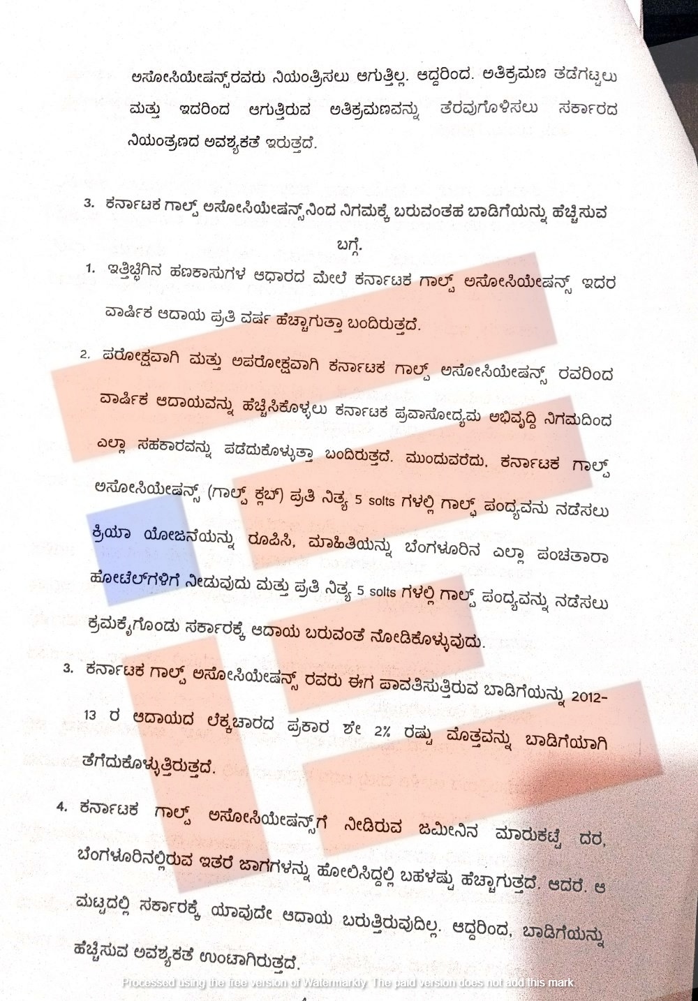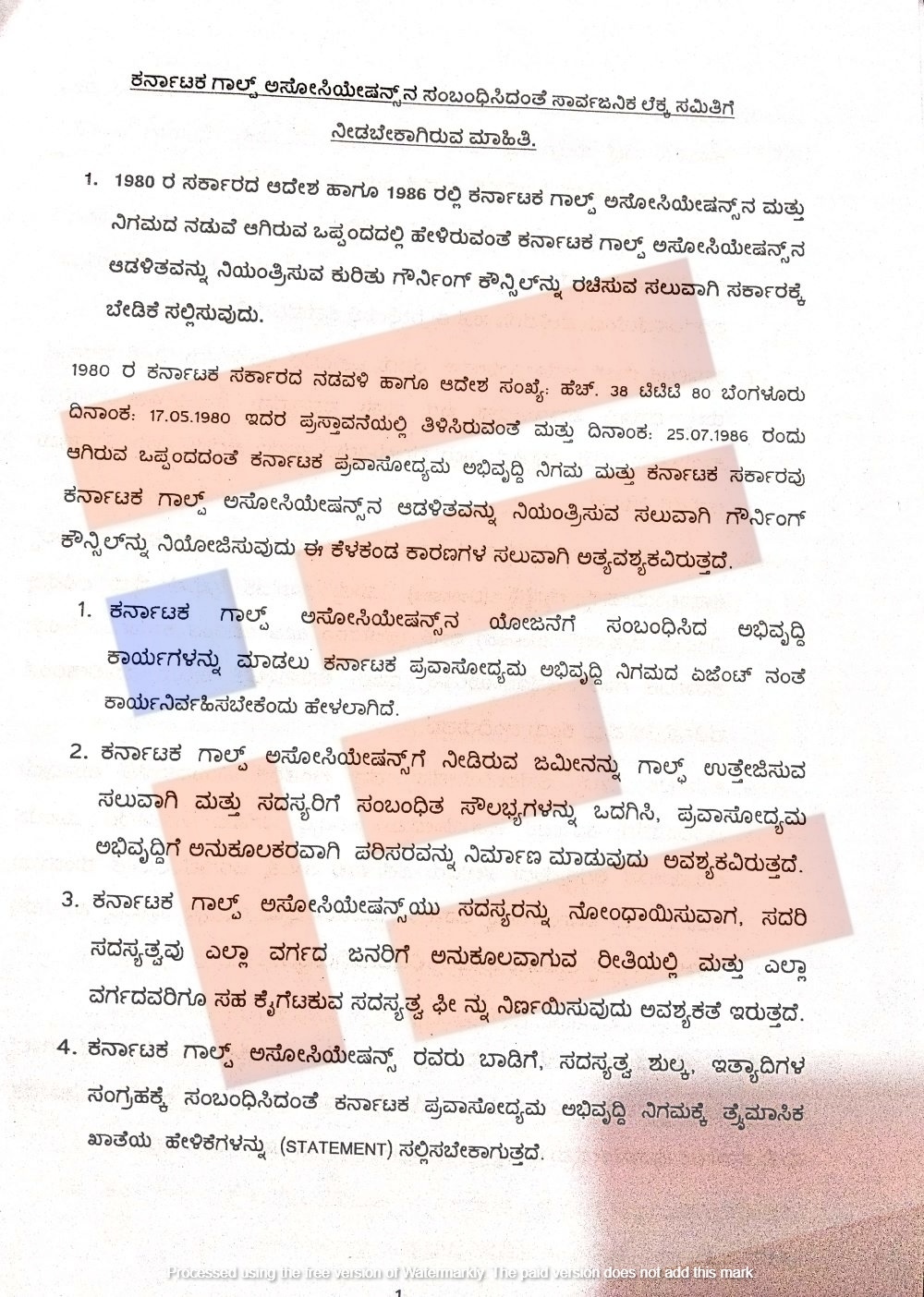 ಕರ್ನಾಟಕ ಗಾಲ್ಫ್‌ ಅಸೋಸಿಯೇಷನ್‌ಗೆ ಸಂಬಂಧಿಸಿದಂತೆ ಸಾರ್ವಜನಿಕ ಲೆಕ್ಕಪತ್ರ ಸಮಿತಿಗೆ  ಕಂದಾಯ ಇಲಾಖೆಯು ಮಾಹಿತಿ ಒದಗಿಸಿದೆ. ಇದರ ಪ್ರತಿಯು ‘ದಿ ಫೈಲ್‌’ಗೆ ಲಭ್ಯವಾಗಿದೆ.