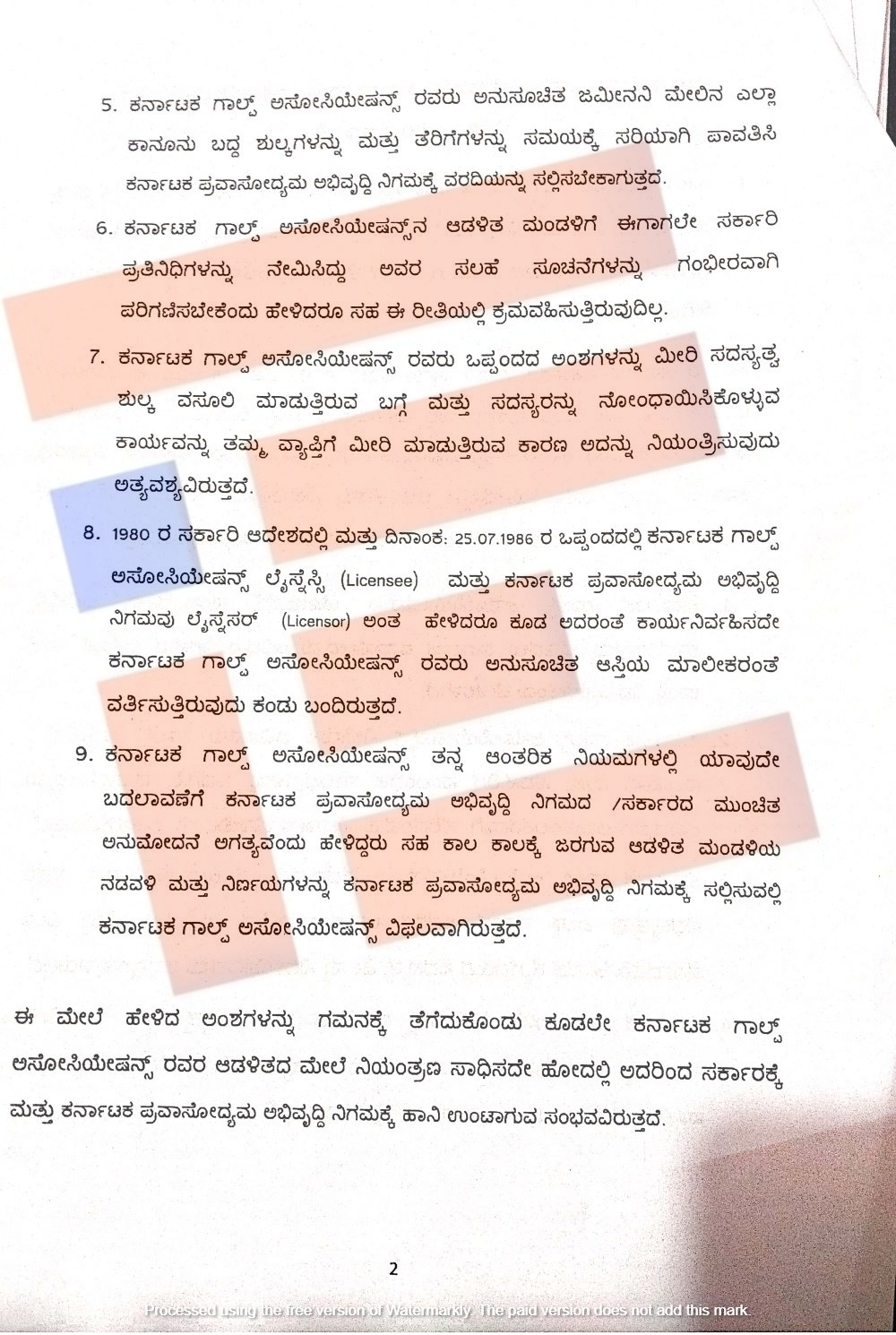 ಕರ್ನಾಟಕ ಗಾಲ್ಫ್‌ ಅಸೋಸಿಯೇಷನ್‌ ಆಡಳಿತವನ್ನು ನಿಯಂತ್ರಿಸಲು ಹೊರಟಿರುವ ಸರ್ಕಾರವು, ಹಲವು ಸಮರ್ಥನೀಯ ಅಂಶಗಳನ್ನು ಪಟ್ಟಿ ಮಾಡಿದೆ. ಅದರಂತೆಯೇ 1980ರಲ್ಲಿ ಸರ್ಕಾರ ಹೊರಡಿಸಿದ್ದ ಆದೇಶ, 1986ರಲ್ಲಿ ಕರ್ನಾಟಕ ಗಾಲ್ಫ್‌ ಅಸೋಸಿಯೇಷನ್‌ ಮತ್ತು ನಿಗಮದ ನಡುವೆ ಆಗಿರುವ ಒಪ್ಪಂದವನ್ನು ಮುನ್ನೆಲೆಗೆ ತಂದಿದೆ. ಇದರ ಪ್ರಕಾರ ಗಾಲ್ಫ್‌ ಅಸೋಸಿಯೇಷನ್‌ನ ಆಡಳಿತವನ್ನು ನಿಯಂತ್ರಿಸುವ ಕುರಿತು ಗೌರ್ನಿಂಗ್ ಕೌನ್ಸಿಲ್‌ ರಚಿಸಲು ಸರ್ಕಾರಕ್ಕೆ ಬೇಡಿಕೆ ಸಲ್ಲಿಸಬೇಕು ಎಂದು ಕಂದಾಯ ಇಲಾಖೆಯು ಪ್ರಸ್ತಾವವನ್ನೂ ಸಿದ್ಧಪಡಿಸಿದೆ.