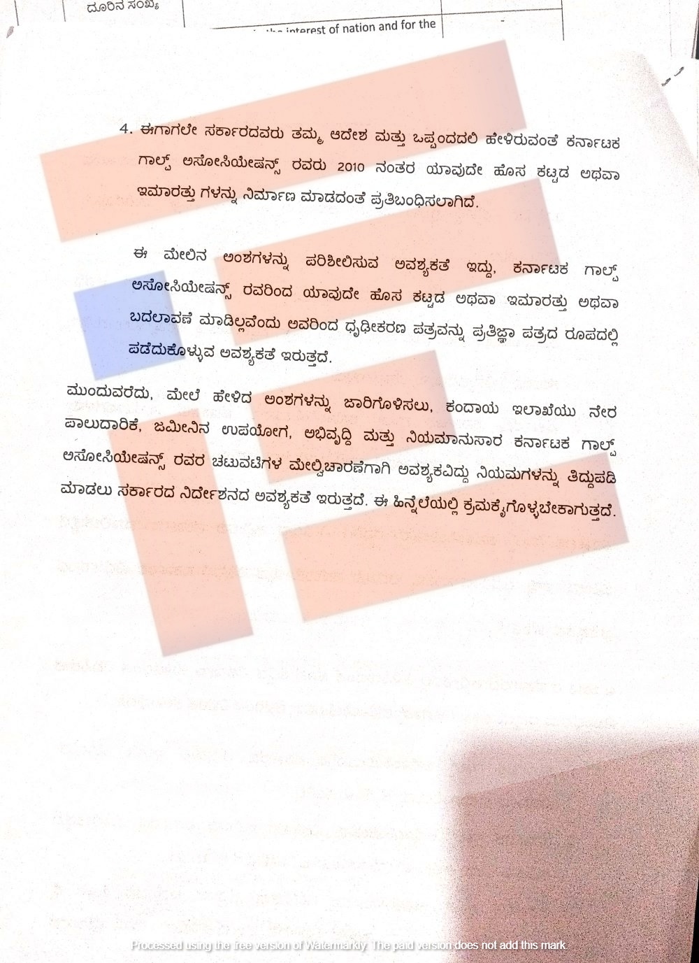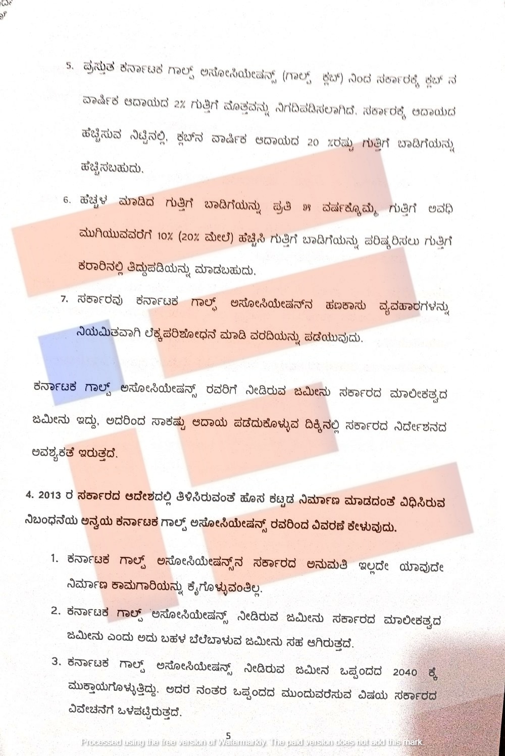 ಗಾಲ್ಫ್‌ ಅಸೋಸಿಯೇಷನ್‌ಗೆ ಸಂಬಂಧಿಸಿದಂತೆ ಸರ್ಕಾರವು 2013ರಲ್ಲಿ ಆದೇಶ ಹೊರಡಿಸಿತ್ತು. ಈ ಆದೇಶದ ಪ್ರಕಾರ ಹೊಸ ಕಟ್ಟಡ ನಿರ್ಮಾಣ ಮಾಡದಂತೆ ನಿಬಂಧನೆ ವಿಧಿಸಿತ್ತು. ಸರ್ಕಾರದ ಅನುಮತಿಯಿಲ್ಲದೇ ಯಾವುದೇ ನಿರ್ಮಾಣ ಕಾಮಗಾರಿ ಕೈಗೊಳ್ಳುವಂತಿಲ್ಲ. ಈ ಅಸೋಸಿಯೇಷನ್‌ಗೆ ನೀಡಿರುವ ಜಮೀನು ಅತ್ಯಂತ ಬೆಲೆಬಾಳಲಿದೆ. ಈ ಜಮೀನಿನ ಒಪ್ಪಂದದ ಅವಧಿಯು 2040ಕ್ಕೆ ಪೂರ್ಣಗೊಳ್ಳಲಿದೆ.