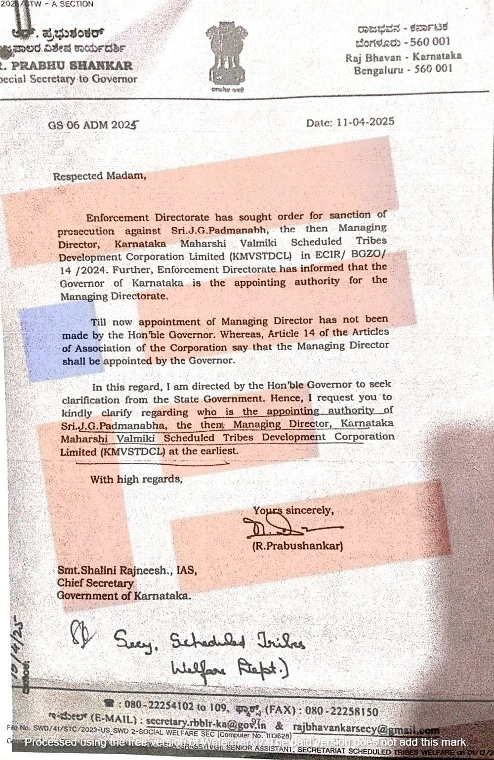 ಜಾರಿ ನಿರ್ದೇಶನಾಲಯದ ಪ್ರಕಾರ ಜೆ ಜೆ ಪದ್ಮನಾಭ ಅವರನ್ನು ವ್ಯವಸ್ಥಾಪಕ ನಿರ್ದೇಶಕರನ್ನಾಗಿ  ರಾಜ್ಯಪಾಲರೇ  ನೇಮಿಸಿದ್ದಾರೆ. ಈ ಸಂಬಂಧ ರಾಜ್ಯಪಾಲರ ಕಚೇರಿಯೂ ಸೂಕ್ತ ಸ್ಪಷ್ಟೀಕರಣ ಬಯಸಿತ್ತು.  ಅಲ್ಲದೇ  2025ರ ಏಪ್ರಿಲ್‌ 11ರಂದೇ ರಾಜ್ಯ ಸರ್ಕಾರದ ಮುಖ್ಯ ಕಾರ್ಯದರ್ಶಿಗೆ  ಈ ಕುರಿತು  ಪತ್ರವನ್ನೂ ಬರೆದಿತ್ತು. ರಾಜ್ಯಪಾಲರ ವಿಶೇಷ ಕಾರ್ಯದರ್ಶಿ ಆರ್ ಪ್ರಭುಶಂಕರ್ ಅವರು ಬರೆದಿದ್ದ ಪತ್ರದ ಪ್ರತಿಯು ‘ದಿ ಫೈಲ್‌’ಗೆ ಲಭ್ಯವಾಗಿದೆ.