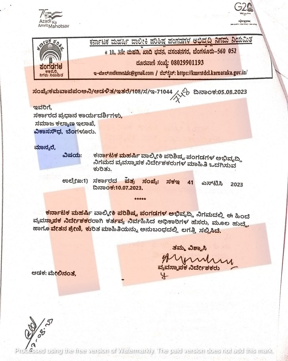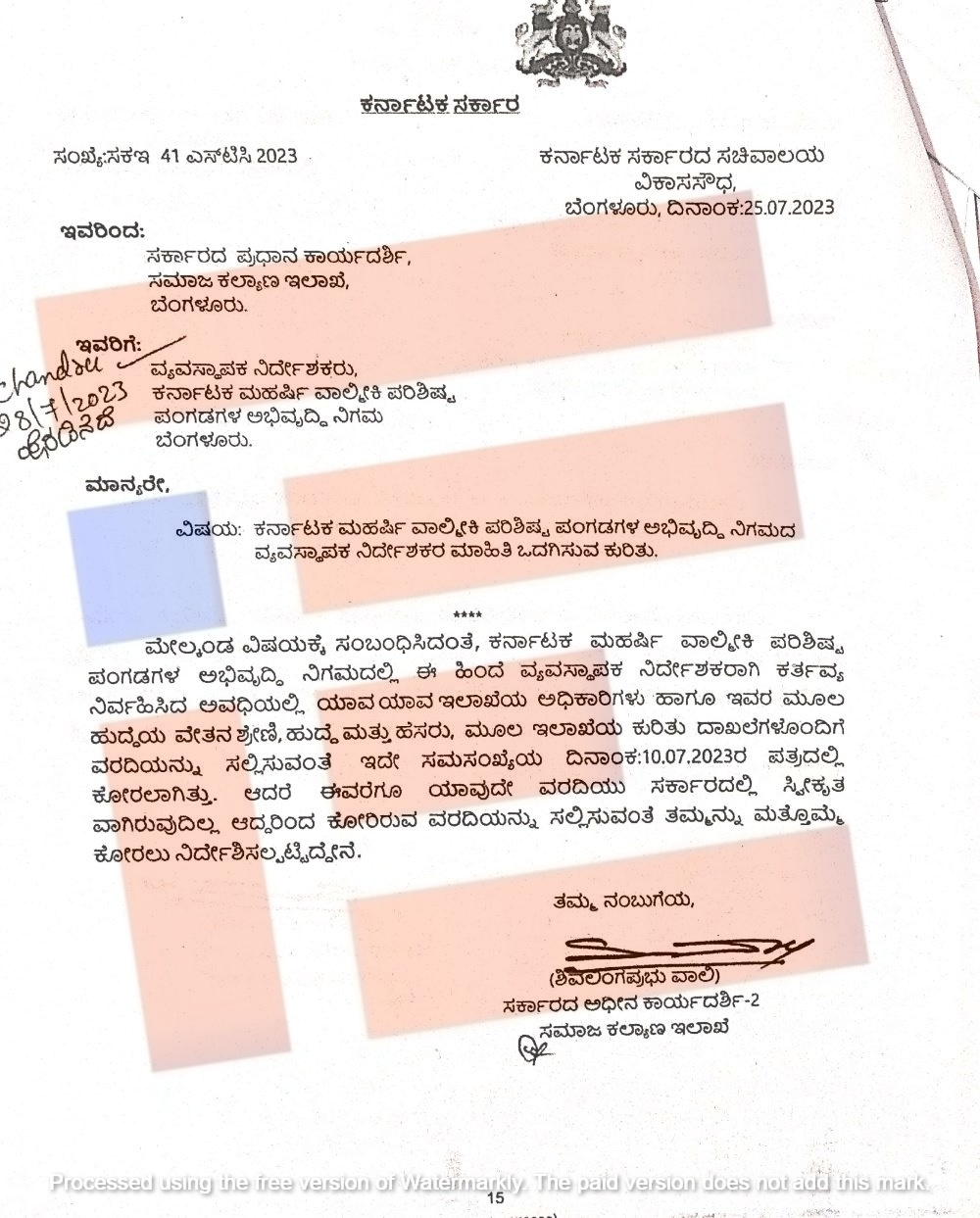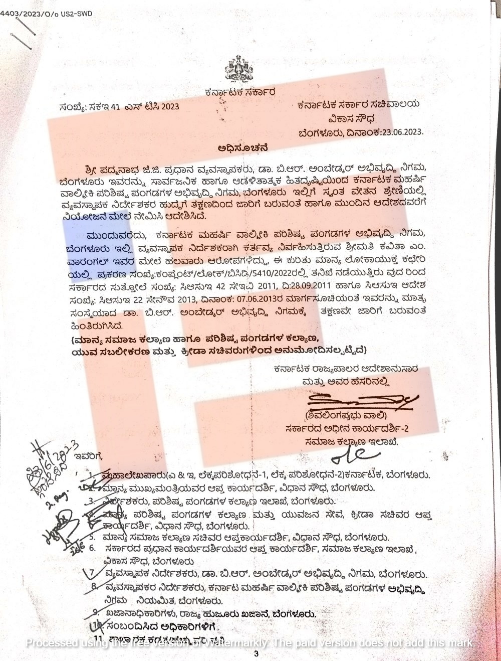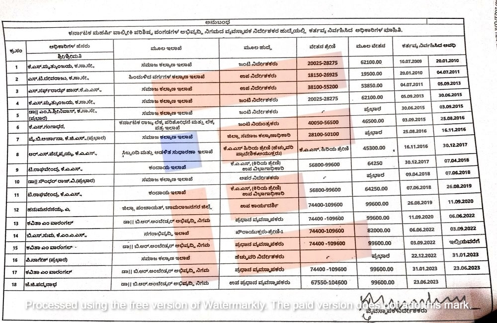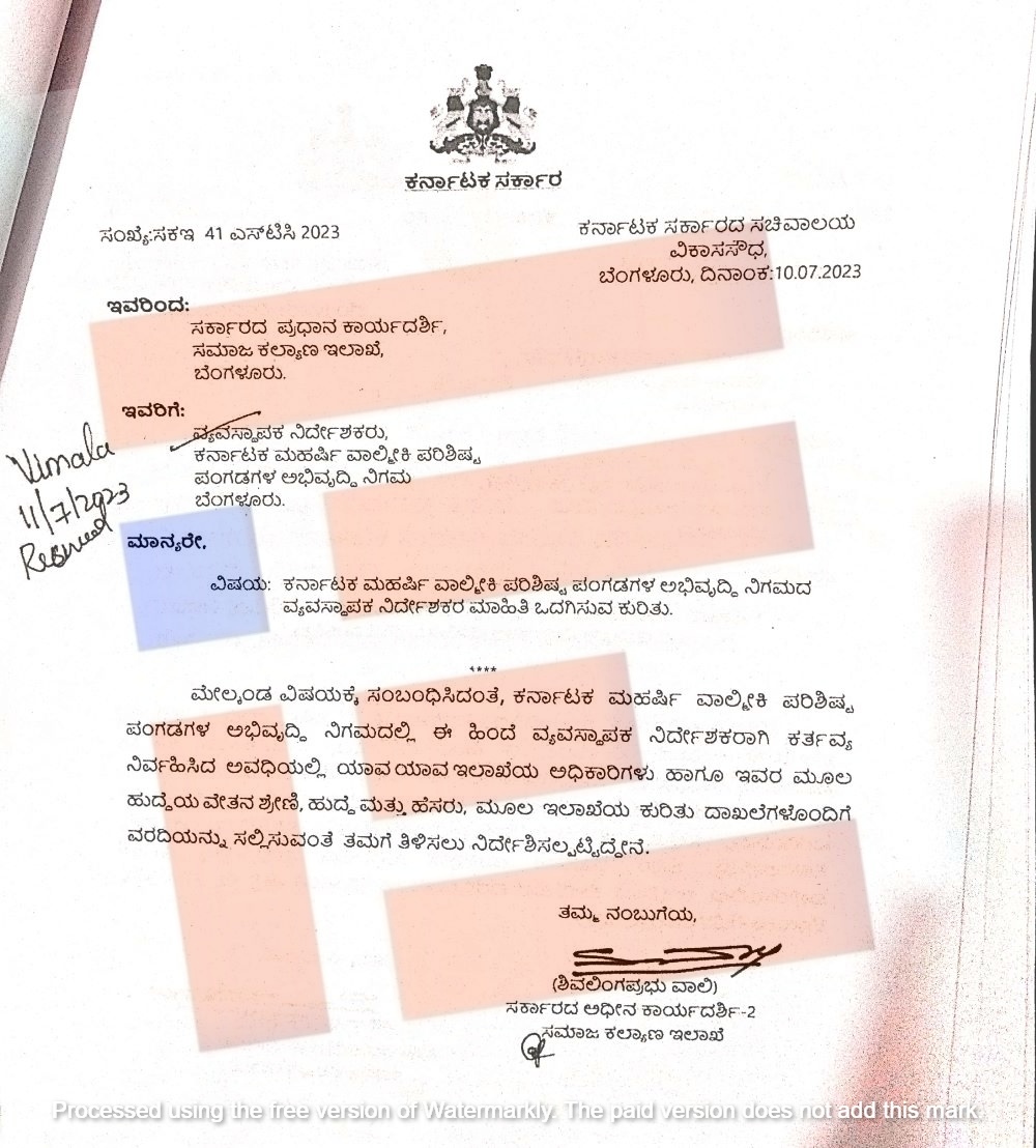 ಇದನ್ನಾಧರಿಸಿ ಕರ್ನಾಟಕ ಮಹರ್ಷಿ ವಾಲ್ಮೀಕಿ ಪರಿ‍ಶಿಷ್ಟ ಪಂಗಡಗಳ ಅಭಿವೃದ್ಧಿ ನಿಗಮದಲ್ಲಿ ಈ ಹಿಂದೆ ವ್ಯವಸ್ಥಾಪಕ ನಿರ್ದೇಶಕರಾಗಿ ಕಾರ್ಯನಿರ್ವಹಿಸಿದ್ದ ಅವಧಿಯಲ್ಲಿ ಯಾವ ಯಾವ ಇಲಾಖೆಯ ಅಧಿಕಾರಿಗಳು ಹಾಗೂ ಇವರ ಮೂಲ ಹುದ್ದೆಯ ವೇತನ ಶ್ರೇಣಿಯ, ಹುದ್ದೆ ಹೆಸರು ಮತ್ತು ಮೂಲ ಇಲಾಖೆಯ ದಾಖಲೆಗಳ ವರದಿಯನ್ನು ಸಮಾಜ ಕಲ್ಯಾಣ ಇಲಾಖೆಯು ಕೇಳಿತ್ತು. ಈ ಸಂಬಂಧ 2023ರ ಜುಲೈ 10ರಂದು ಪತ್ರ ಬರೆದಿತ್ತು. ಈ ಈ ಪತ್ರಕ್ಕೆ ನಿಗಮವು ಯಾವುದೇ ವರದಿ ಸಲ್ಲಿಸಿರಲಿಲ್ಲ.