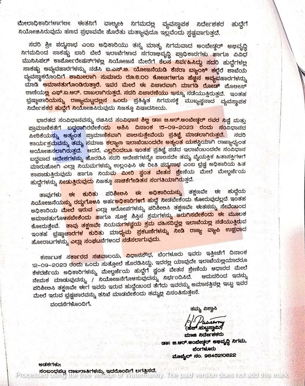 ಈ ಪ್ರಕ್ರಿಯೆಗಳು ನಡೆಯುತ್ತಿದ್ದ ಹೊತ್ತಿನಲ್ಲೇ ಡಾ ಬಿ ಆರ್ ಅಂಬೇಡ್ಕರ್ ಅಭಿವೃದ್ಧಿ ನಿಗಮದ ಮಾಜಿ ನಿರ್ದೇಶಕ ಹೆಚ್‌ ಪುಟ್ಟಸ್ವಾಮಿ ಎಂಬುವರು ರಾಜ್ಯ ಸರ್ಕಾರದ ಮುಖ್ಯ ಕಾರ್ಯದರ್ಶಿಗಳಾಗಿದ್ದ ವಂದಿತಾ ಶರ್ಮಾ ಅವರಿಗೆ ಲಿಖಿತ ದೂರು ಸಲ್ಲಿಸಿದ್ದರು.