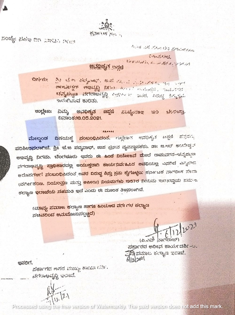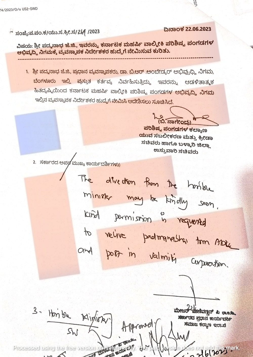 ಇದಾದ ನಂತರ ಜೆ ಜೆ ಪದ್ಮನಾಭ ಅವರ ನೇಮಕಾತಿ ಸಂಬಂಧ ಸೂಕ್ತ ತಿದ್ದುಪಡಿ ಆದೇಶ ಹೊರಡಿಸಲು ಅಂಬೇಡ್ಕರ್ ಅಭಿವೃದ್ಧಿ ನಿಗಮದ ವ್ಯವಸ್ಥಾಪಕ ನಿರ್ದೇಶಕರು 2023ರ ಜುಲೈ 3ರಂದು ಸಮಾಜ ಕಲ್ಯಾಣ ಇಲಾಖೆಯ ಸರ್ಕಾರದ ಪ್ರಧಾನ ಕಾರ್ಯದರ್ಶಿಗೆ ಪತ್ರ ಬರೆದಿದ್ದರು.