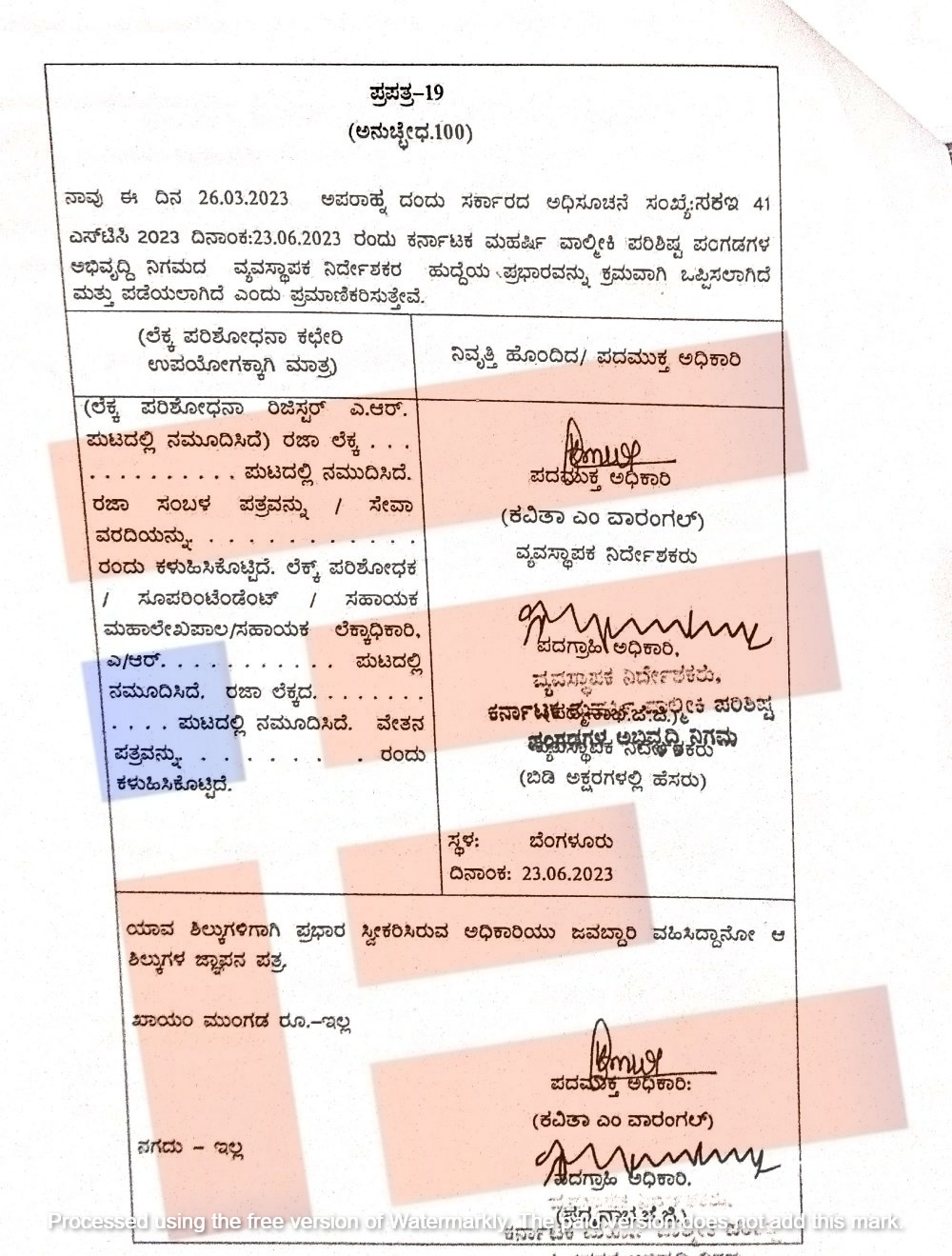 ಕವಿತಾ ವಾರಂಗಲ್ ಅವರ ಸೇವೆಯನ್ನು ಡಾ ಬಿ ಆರ್ ಅಂಬೇಡ್ಕರ್ ಅಭಿವೃದ್ಧಿ ನಿಗಮಕ್ಕೆ ಹಿಂದಿರುಗಿಸಿತ್ತು. 2023ರ ಜೂನ್‌ 27ರಂದು ಅಧಿಸೂಚನೆ ಹೊರಡಿಸಿತ್ತು.