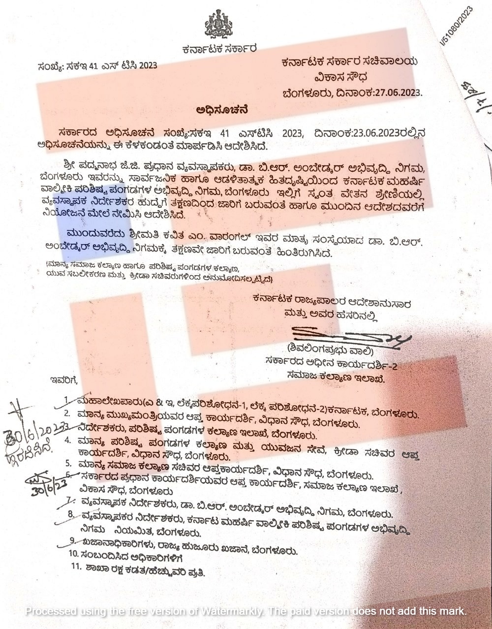 ಇದಾದ ನಂತರ  ಸಾರ್ವಜನಿಕ ಮತ್ತು ಆಡಳಿತಾತ್ಮಕ ಹಿತದೃಷ್ಟಿ ಹೆಸರಿನಲ್ಲಿ ಕರ್ನಾಟಕ ಮಹರ್ಷಿ ವಾಲ್ಮೀಕಿ ಪರಿಶಿಷ್ಟ ಪಂಗಡಗಳ ಅಭಿವೃದ್ಧಿ ನಿಗಮಕ್ಕೆ ಸ್ವಂತ ವೇತನ ಶ್ರೇಣಿಯಲ್ಲಿ ವ್ಯವಸ್ಥಾಪಕ ನಿರ್ದೇಶಕರ ಹುದ್ದೆಗೆ ಜೆ ಜೆ ಪದ್ಮನಾಭ ಅವರನ್ನು ಸಮಾಜ ಕಲ್ಯಾಣ ಇಲಾಖೆಯು ನೇಮಿಸಿತ್ತು.   2023ರ ಜೂನ್‌ 23ರಂದೇ ಅಧಿಸೂಚನೆ ಹೊರಡಿಸಿತ್ತು.
