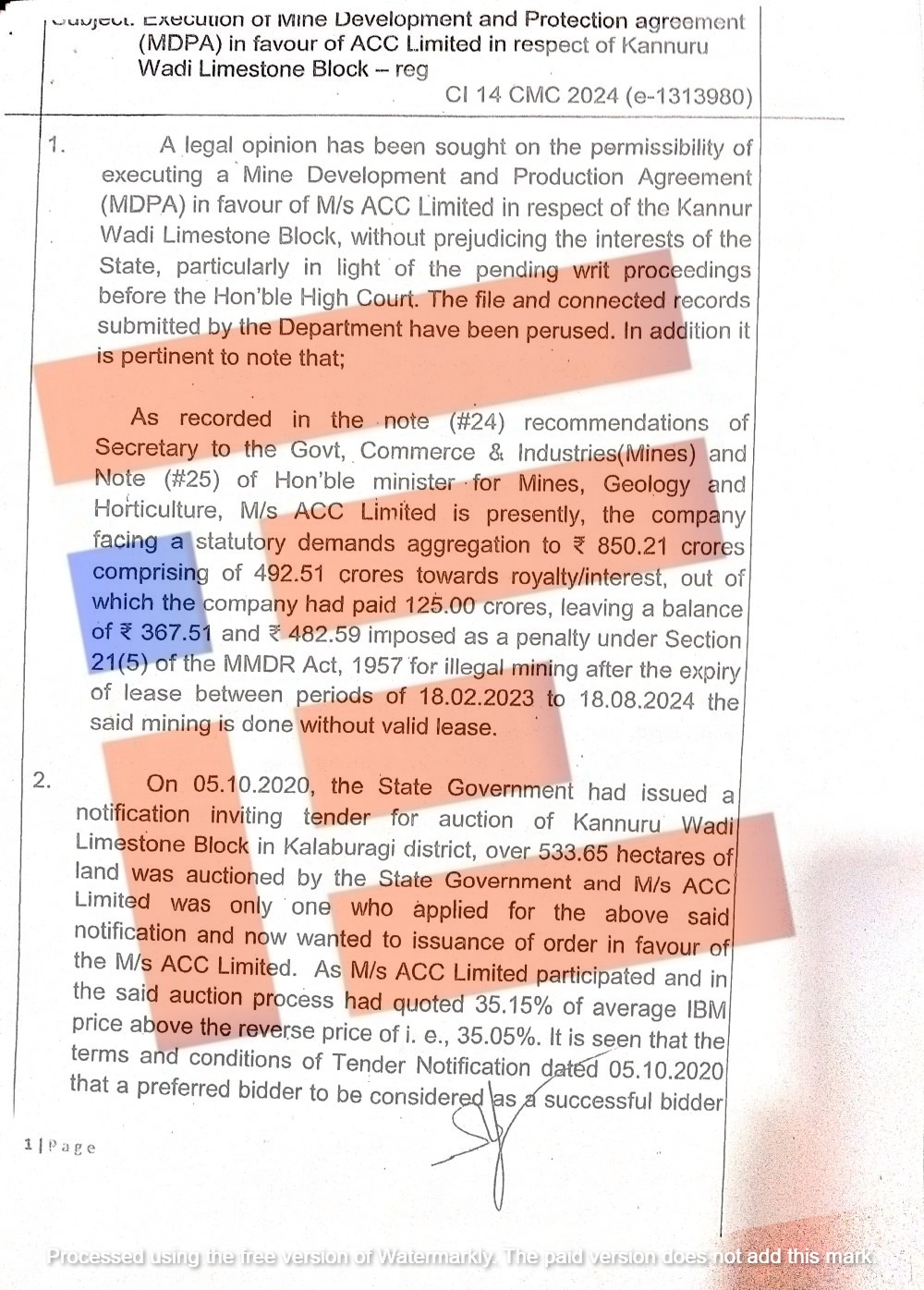 ಎಸಿಸಿ ಲಿಮಿಟೆಡ್ ಪುನಃ ಹರಾಜು ಮೂಲಕ ಪಡೆದಿರುವ ಕಣ್ಣೂರು ವಾಡಿ ಸುಣ್ಣದ ಕಲ್ಲು ಬ್ಲಾಕ್ನ ಯಶಸ್ವಿ ಬಿಡ್ದಾರರೆಂದು ಘೋಷಿಸುವ ಸಂದರ್ಭದಲ್ಲಿ 2021ರ ಸೆ.27ರಂದು ಅಫಿಡೆವಿಟ್ನಲ್ಲಿ ಸಲ್ಲಿಸಿರುವ ಅಂಡರ್ ಟೇಕಿಂಗ್ನ ಷರತ್ತಿಗೆ ಒಳಪಟ್ಟು ಎಂಡಿಪಿಎ ಕಾಯ್ದೆಯನ್ನು ಕಾರ್ಯಗತಗೊಳಿಸುವ ಕುರಿತು ಗಣಿ ಮತ್ತು ಭೂ ವಿಜ್ಞಾನ ಇಲಾಖೆಯ ನಿರ್ದೇಶಕರು ಪ್ರಸ್ತಾವನೆ ಸಲ್ಲಿಸಿರುತ್ತಾರೆ. ಸದ್ಯ ಲೆಟರ್ ಆಫ್ ಇಂಟೆಂಟ್ನ ಅವಧಿಯು ಮುಕ್ತಾಯವಾಗುತ್ತಿರುವುದರಿಂದ ಉಚ್ಛ ನ್ಯಾಯಾಲಯದಲ್ಲಿ ಇತ್ಯರ್ಥವಾಗುವ ಪ್ರಕರಣಗಳ ಆದೇಶವನ್ನು ಪಾಲಲಿಸುವ ಷರತ್ತಿಗೆ ಒಳಪಟ್ಟು ಸದರಿಯವರಿಂದ ಪುನಃ ಅಫಡೆವಿಟ್ ಪಡೆದು ಎಸಿಸಿ ಲಿಮಿಟೆಡ್ಗೆ ಎಂಡಿಪಿಎನ್ನು ಕಾರ್ಯಗತ ಮಾಡುವ ಕುರಿತಂತೆ ಅಡ್ವೋಕೇಟ್ ಜನರಲ್ ಅವರ ಅಭಿಪ್ರಾಯ ಪಡೆದು ಸಲ್ಲಿಸಬೇಕು ಎಂದು ಗಣಿ ಸಚಿವ ಎಸ್ ಎಸ್ ಮಲ್ಲಿಕಾರ್ಜುನ್ ಅವರು ಸೂಚಿಸಿರುವುದು ದಾಖಲೆಯಿಂದ ಗೊತ್ತಾಗಿದೆ.