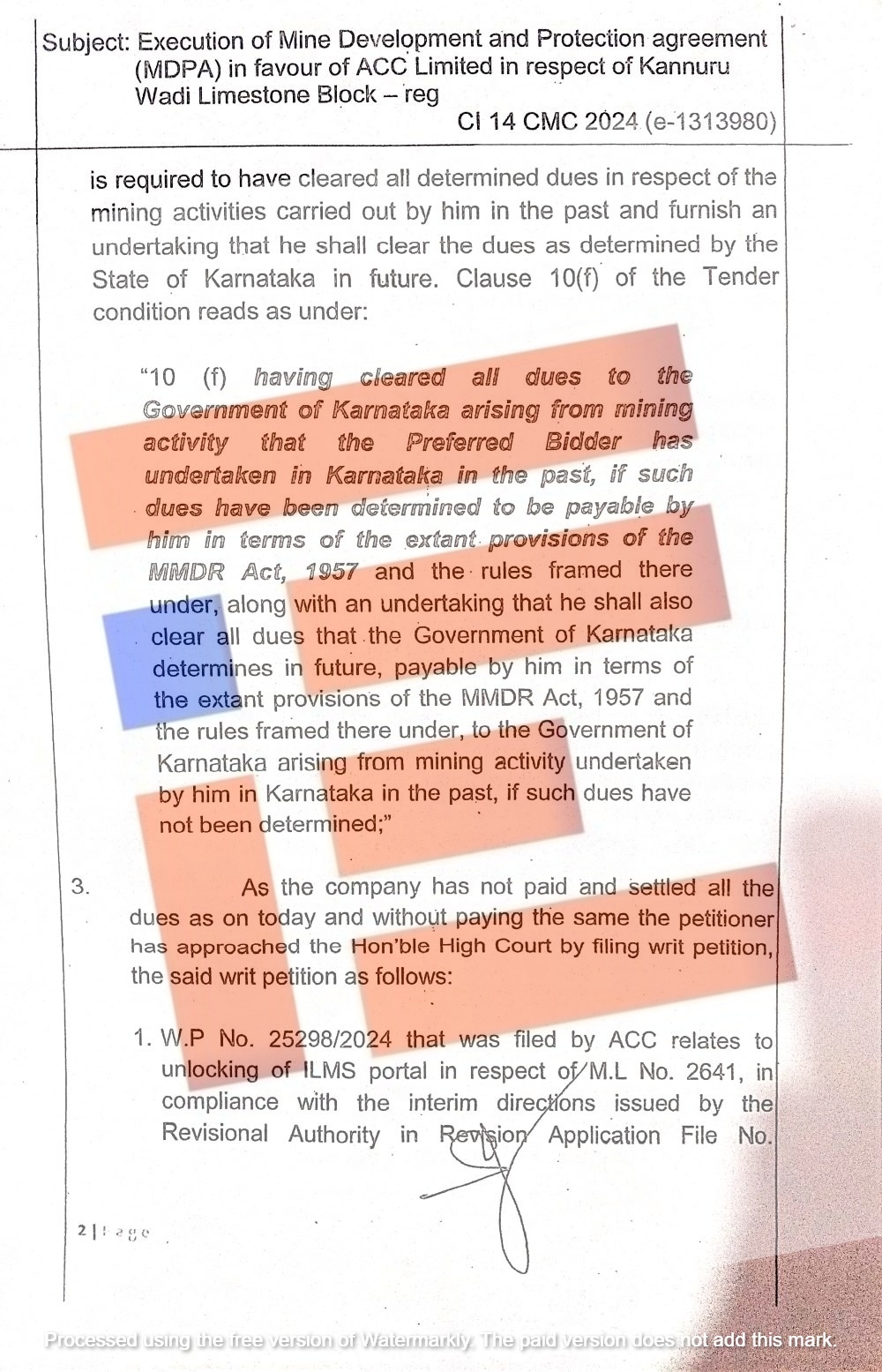 ಎಸಿಸಿ ಲಿಮಿಟೆಡ್ ಅನ್ನು ಯಶಸ್ವಿ ಬಿಡ್ಡರ್ (ಎಂ.ಎಲ್. ಸಂಖ್ಯೆ. 2641) ಎಂದು ಘೋಷಿಸುವಾಗಲೇ ಕಂಪನಿಯು ನಿರ್ವಹಿಸುವ ಗಣಿಗಾರಿಕೆ ಗುತ್ತಿಗೆಗಳಿಗೆ ಸಂಬಂಧಿಸಿದಂತೆ ಕರ್ನಾಟಕ ಸರ್ಕಾರಕ್ಕೆ ಬಾಕಿ ಇರುವ ಮತ್ತು ಪಾವತಿಸಬೇಕಾದ ಎಲ್ಲಾ ಬಾಕಿಗಳನ್ನು ಪಾವತಿಸಲು ಕಂಪನಿಯು ಕ್ರಮ ಕೈಗೊಳ್ಳುತ್ತದೆ ಎಂದು ಟೆಂಡರ್ ದಾಖಲೆಯ ನಿಯಮಗಳು ಮತ್ತು ಷರತ್ತುಗಳ ಪ್ರಕಾರ 2021ರ ಸೆ.27ರಂದು ಪ್ರಮಾಣ ಪತ್ರ ರೂಪದಲ್ಲಿ ಕಂಪನಿಯು ಸಲ್ಲಿಸಿತ್ತು.