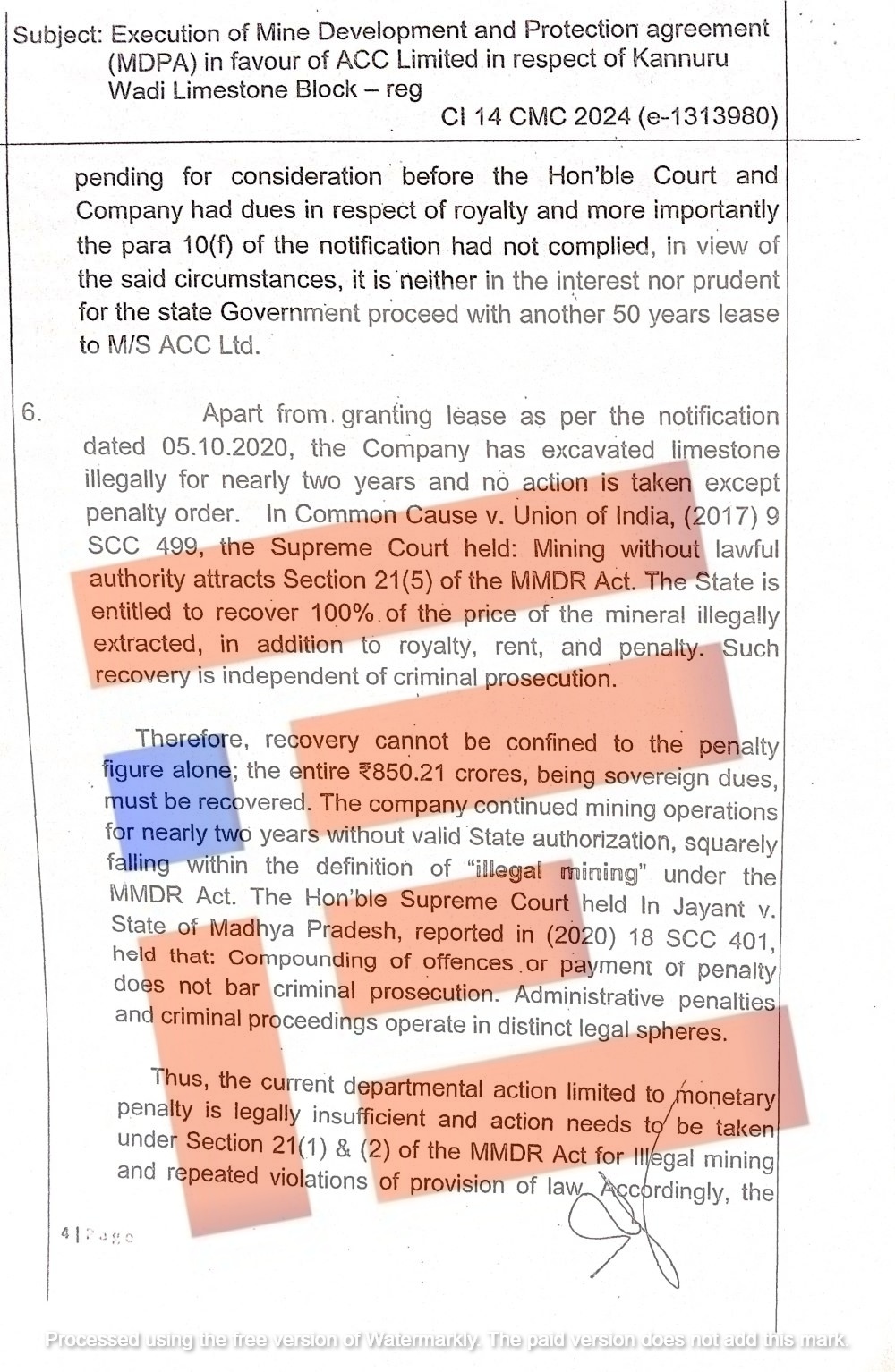 2020ರ ಅಕ್ಟೋಬರ್ 5ರಂದು ಹೊರಡಿಸಿದ್ದ ಅಧಿಸೂಚನೆ ಪ್ರಕಾರ ಎಸಿಸಿ ಲಿಮಿಟೆಡ್ ಸುಮಾರು 2 ವರ್ಷಗಳ ಕಾಲ ಕಾನೂನುಬಾಹಿರವಾಗಿ ಸುಣ್ಣದ ಕಲ್ಲು ಗಣಿಗಾರಿಕೆ ನಡೆಸಿದೆ. ದಂಡ ವಸೂಲಿ ಮಾಡುವ ಆದೇಶ ಹೊರಡಿಸಿರುವುದನ್ನು ಹೊರತುಪಡಿಸಿದರೇ ಬೇರೆ ಯಾವುದೇ ಕ್ರಮವಹಿಸಿಲ್ಲ. ಕಾಮನ್ ಕಾಸ್/ ಯೂನಿಯನ್ ಆಫ್ ಇಂಡಿಯಾದ 2017ರ ಪ್ರಕರಣದಲ್ಲಿ ಸುಪ್ರೀಕೋರ್ಟ್ ನೀಡಿರುವ ತೀರ್ಪನ್ನು ಕಾನೂನು ಅಭಿಪ್ರಾಯದಲ್ಲಿ ಉಲ್ಲೇಖವಾಗಿದೆ.