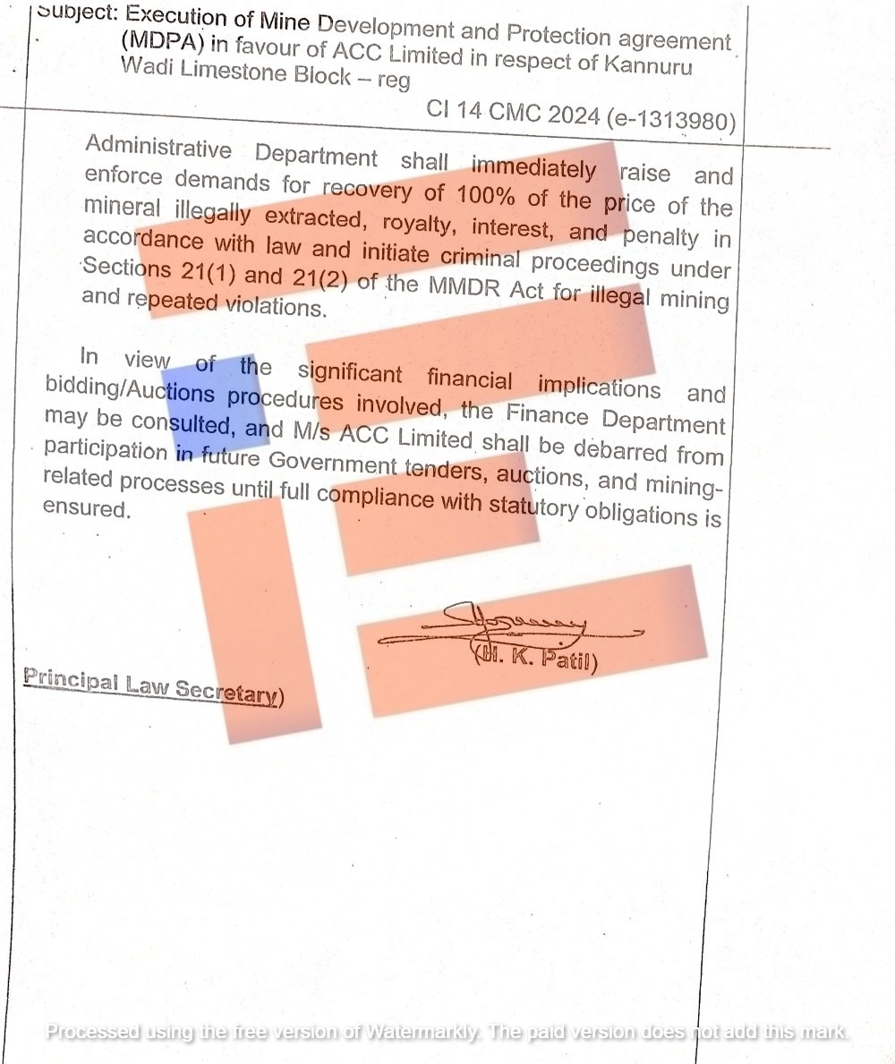 ಅದಾನಿ ಸಮೂಹದ ಎಸಿಸಿ ಸಿಮೆಂಟ್ಸ್ ಪ್ರೈವೈಟ್ ಲಿಮಿಟೆಡ್, ಕಾನೂನುಬಾಹಿರ ಗಣಿಗಾರಿಕೆ ಮತ್ತು ಕಾನೂನಿನ ನಿಬಂಧನೆಗಳನ್ನು ಪುನರಾವರ್ತಿತವಾಗಿ ಉಲ್ಲಂಘಿಸಿರುವ ಗಂಭೀರ ಆರೋಪಕ್ಕೆ ಗುರಿಯಾಗಿದೆ. ಎಂಎಂಡಿಆರ್ ಕಾಯ್ದೆ ಸೆಕ್ಷನ್ 21 (1) ಮತ್ತು (2)ರ ಅಡಿಯಲ್ಲಿ ಕೈಗಾರಿಕೆ ಮತ್ತು ವಾಣಿಜ್ಯ ಇಲಾಖೆಯು ಕ್ರಮ ಕೈಗೊಳ್ಳುವಲ್ಲಿ (ಗಣಿ ), ಸಂಪೂರ್ಣವಾಗಿ ವಿಫಲವಾಗಿದೆ.