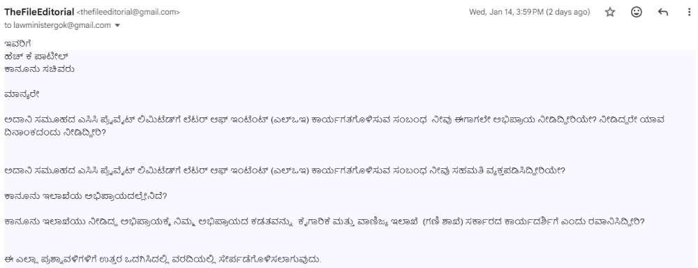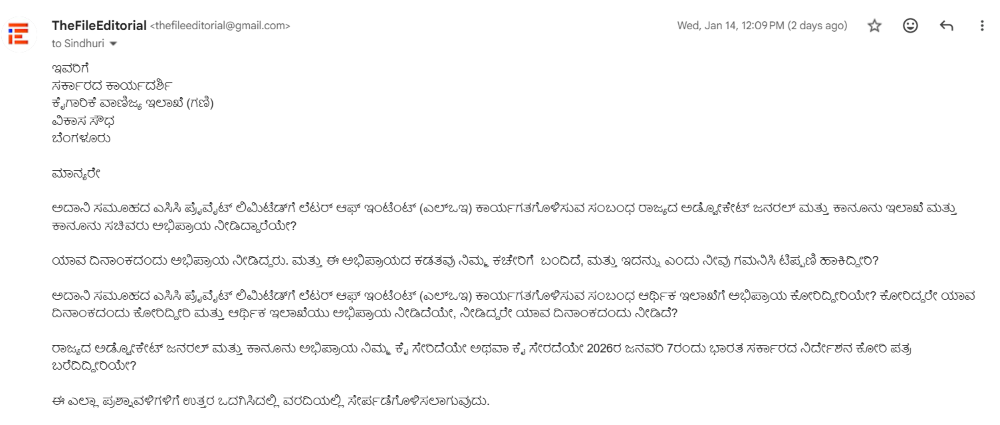 ಈ ಕುರಿತು ಕೈಗಾರಿಕೆ ಮತ್ತು ವಾಣಿಜ್ಯ ಇಲಾಖೆಯ ಸರ್ಕಾರದ ಕಾರ್ಯದರ್ಶಿ (ಗಣಿ) ರೋಹಿಣಿ ಸಿಂಧೂರಿ ಅವರ ಪ್ರತಿಕ್ರಿಯೆ ಪಡೆಯಲು ‘ದಿ ಫೈಲ್’, 2026ರ ಜನವರಿ 14ರಂದೇ ಇ-ಮೈಲ್ ಮೂಲಕ ಪ್ರಶ್ನಾವಳಿ ಕಳಿಸಿತ್ತು.