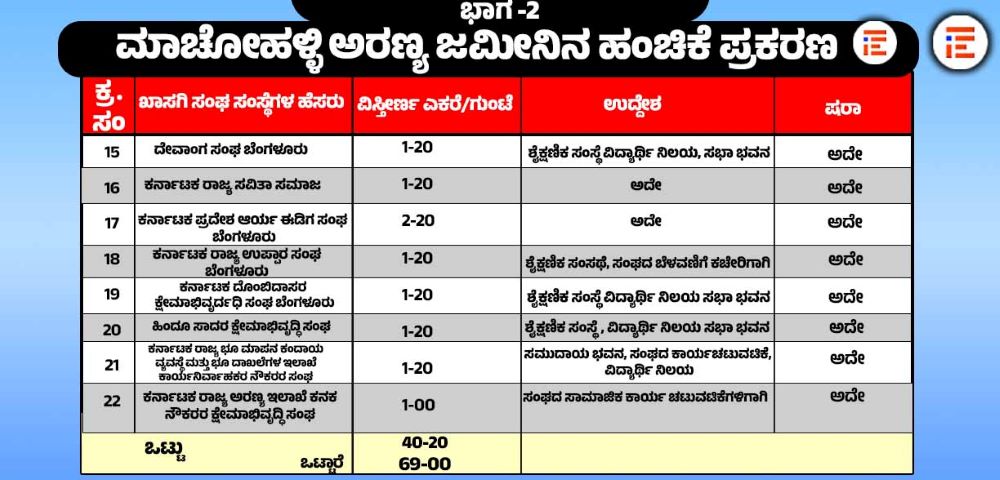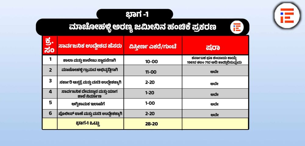ಮಾಚೋಹಳ್ಳಿ ಅರಣ್ಯ ಜಮೀನನ್ನು ಸಂಘ ಸಂಸ್ಥೆಗಳಿಗೆ ಮಂಜೂರು ಮಾಡಿರುವ ಪ್ರಕರಣವು ಉಚ್ಛ ನ್ಯಾಯಾಲಯದಲ್ಲಿ ವಿಚಾರಣೆ ಹಂತದಲ್ಲಿದೆ. ಈ ಪ್ರಕರಣದ ವಿಚಾರಣೆಯು 2026ರ ಏಪ್ರಿಲ್ 1ಕ್ಕೆ ನಿಗದಿಯಾಗಿದೆ. ಈ ಬೆಳವಣಿಗೆಯ ನಡುವೆಯೇ ಈ ಪ್ರಕರಣದಲ್ಲಿ ಮೂರು ಇಲಾಖೆಗಳ ಅಸಮ್ಮತಿ ವ್ಯಕ್ತಪಡಿಸಿದ್ದವು ಎಂಬ ಸಂಗತಿಯು ಮುನ್ನೆಲೆಗೆ ಬಂದಿದೆ.