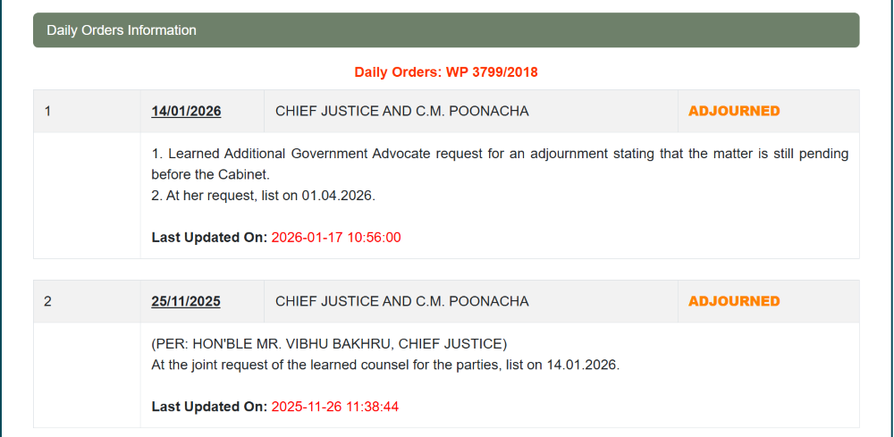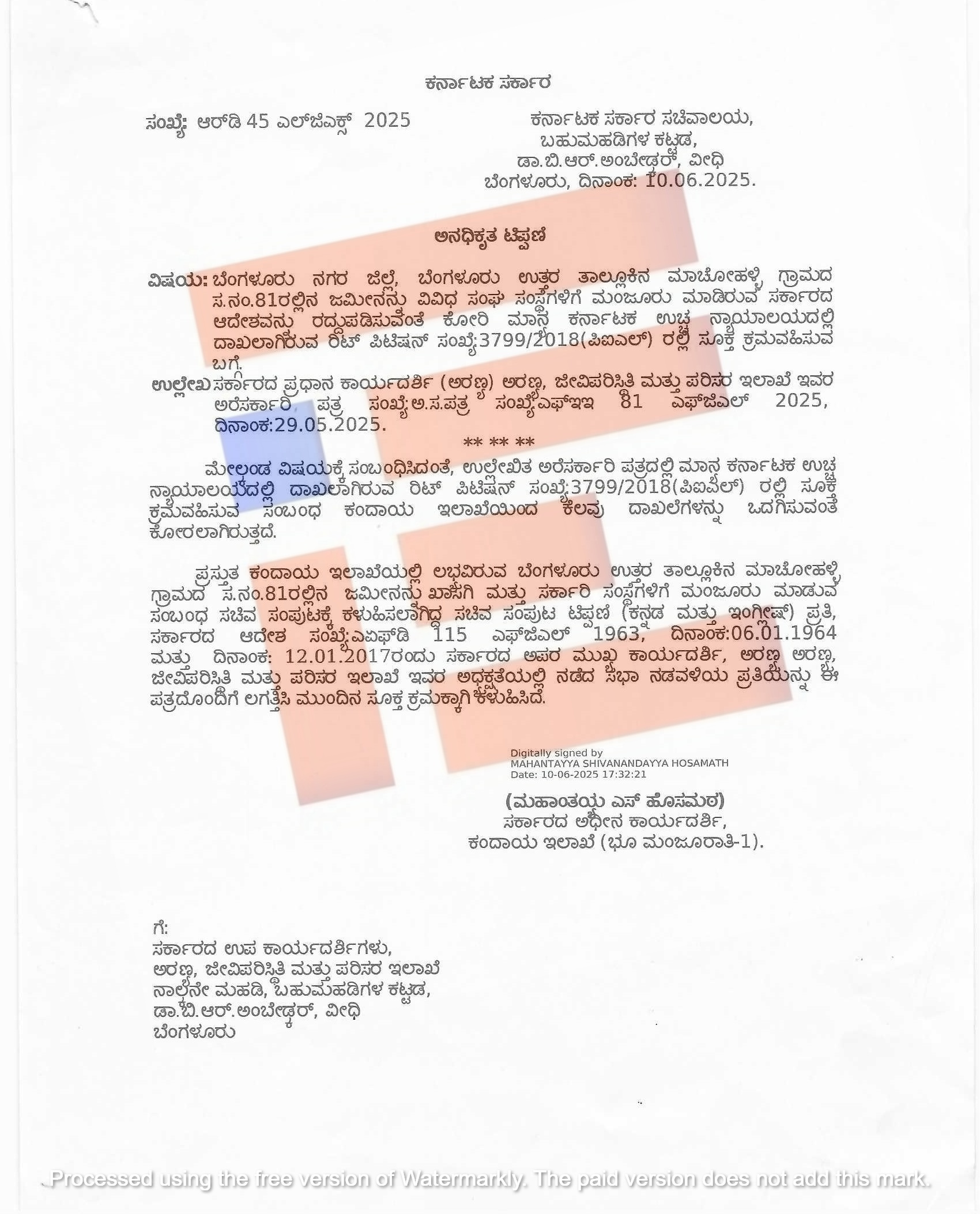 ಬೆಂಗಳೂರು ಉತ್ತರ ತಾಲೂಕಿನ ಮಾಚೋಹಳ್ಳಿ ಗ್ರಾಮದ ಸರ್ವೆ ನಂಬರ್ 81ರಲ್ಲಿನ ಜಮೀನನ್ನು ವಿವಿಧ ಸಂಘ ಸಂಸ್ಥೆಗಳಿಗೆ ಮಂಜೂರು ಮಾಡಿರುವ ಸರ್ಕಾರದ ಆದೇಶವನ್ನು ರದ್ದುಪಡಿಸಬೇಕು ಎಂದು ಉಚ್ಛ ನ್ಯಾಯಾಲಯದಲ್ಲಿ ರಿಟ್ ಅರ್ಜಿ (ಸಂಖ್ಯೆ 3799/2018 ಪಿಐಎಲ್) ದಾಖಲಾಗಿದೆ. ಈ ಅರ್ಜಿ ಕುರಿತು ಕ್ರಮ ಕೈಗೊಳ್ಳಲು ಸಚಿವ ಸಂಪುಟದ ಮುಂದೆ ಬಾಕಿ ಇದೆ. ಹೀಗಾಗಿ ಅರ್ಜಿ ವಿಚಾರಣೆಯನ್ನು ಮುಂದೂಡಬೇಕು ಎಂಧು ರಾಜ್ಯದ ಹೆಚ್ಚುವರಿ ಅಡ್ವೋಕೇಟ್ ಜನರಲ್ ಅವರ ಕೋರಿದ್ದರು. ಹೀಗಾಗಿ ಈ ಅರ್ಜಿ ವಿಚಾರಣೆಯು 2026ರ ಏಪ್ರಿಲ್ 1ಕ್ಕೆ ಮುಂದೂಡಿಕೆಯಾಗಿದೆ.