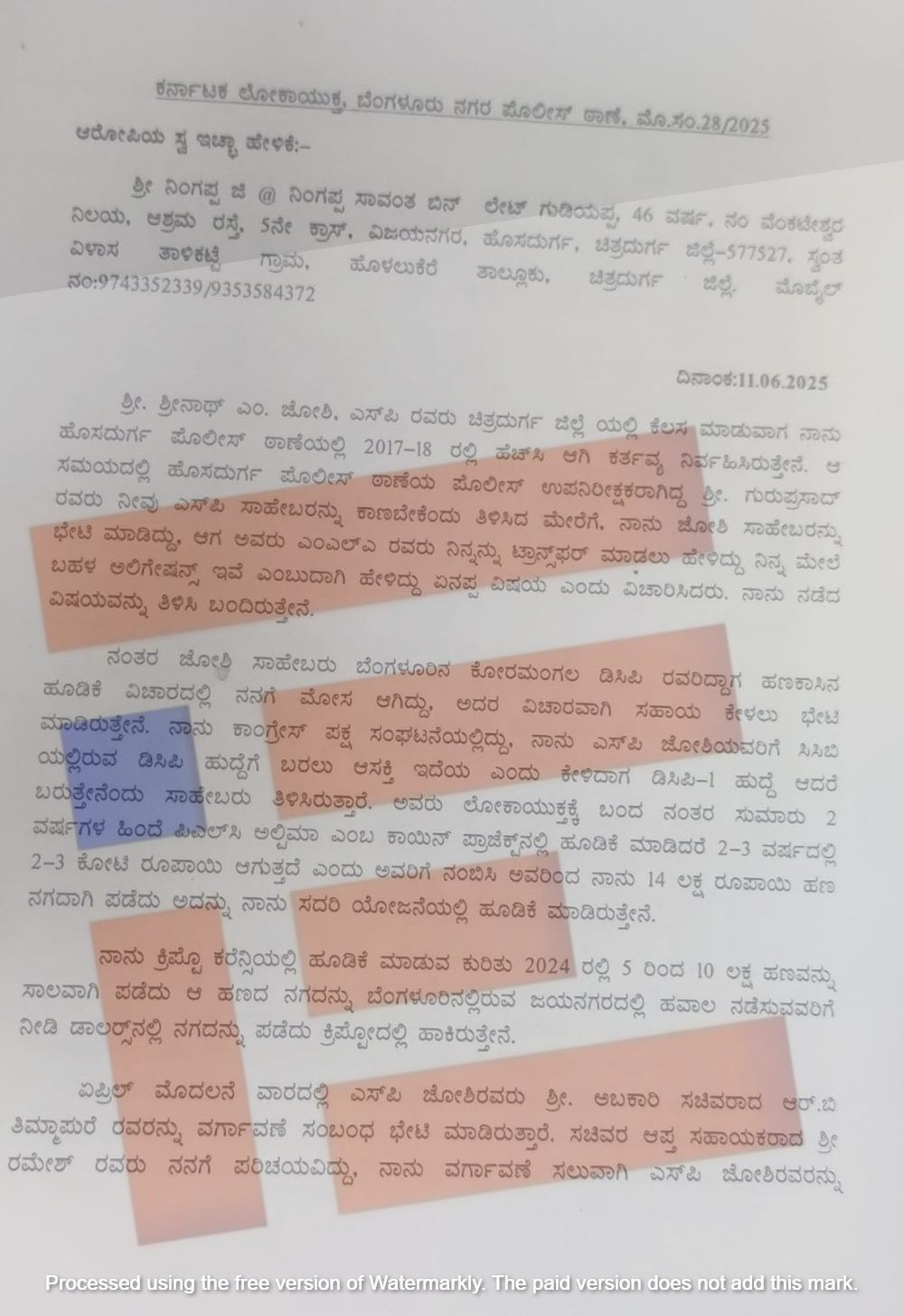 ಲೋಕಾಯುಕ್ತ ಹೆಸರು ಹೇಳಿ ಸರ್ಕಾರಿ ಅಧಿಕಾರಿಗಳಿಂದ ಕೋಟ್ಯಂತರ ರುಪಾಯಿ ವಸೂಲು ಮಾಡಿರುವ ಪ್ರಕರಣಕ್ಕೆ ಸಂಬಂಧಿಸಿದಂತೆ ಬಂಧಿತ ಆರೋಪಿ ನಿಂಗಪ್ಪ ಅಬಕಾರಿ ಇಲಾಖೆಯ ವಿವಿಧ ಅಧಿಕಾರಿಗಳಿಂದ ಕಳೆದ 6 ತಿಂಗಳಿನಿಂದಲೂ ಹಣವನ್ನು ವಸೂಲಿ ಮಾಡಿರುವುದಾಗಿ ಒಪ್ಪಿಕೊಂಡಿದ್ದ ಎಂದು ಲೋಕಾಯುಕ್ತ ಪೊಲೀಸ್ ವಿಭಾಗವು ಇದೀಗ ಅಧಿಕೃತವಾಗಿ ಪತ್ರಿಕಾ ಹೇಳಿಕೆಯನ್ನು ಬಿಡುಗಡೆ ಮಾಡಿತ್ತು.
