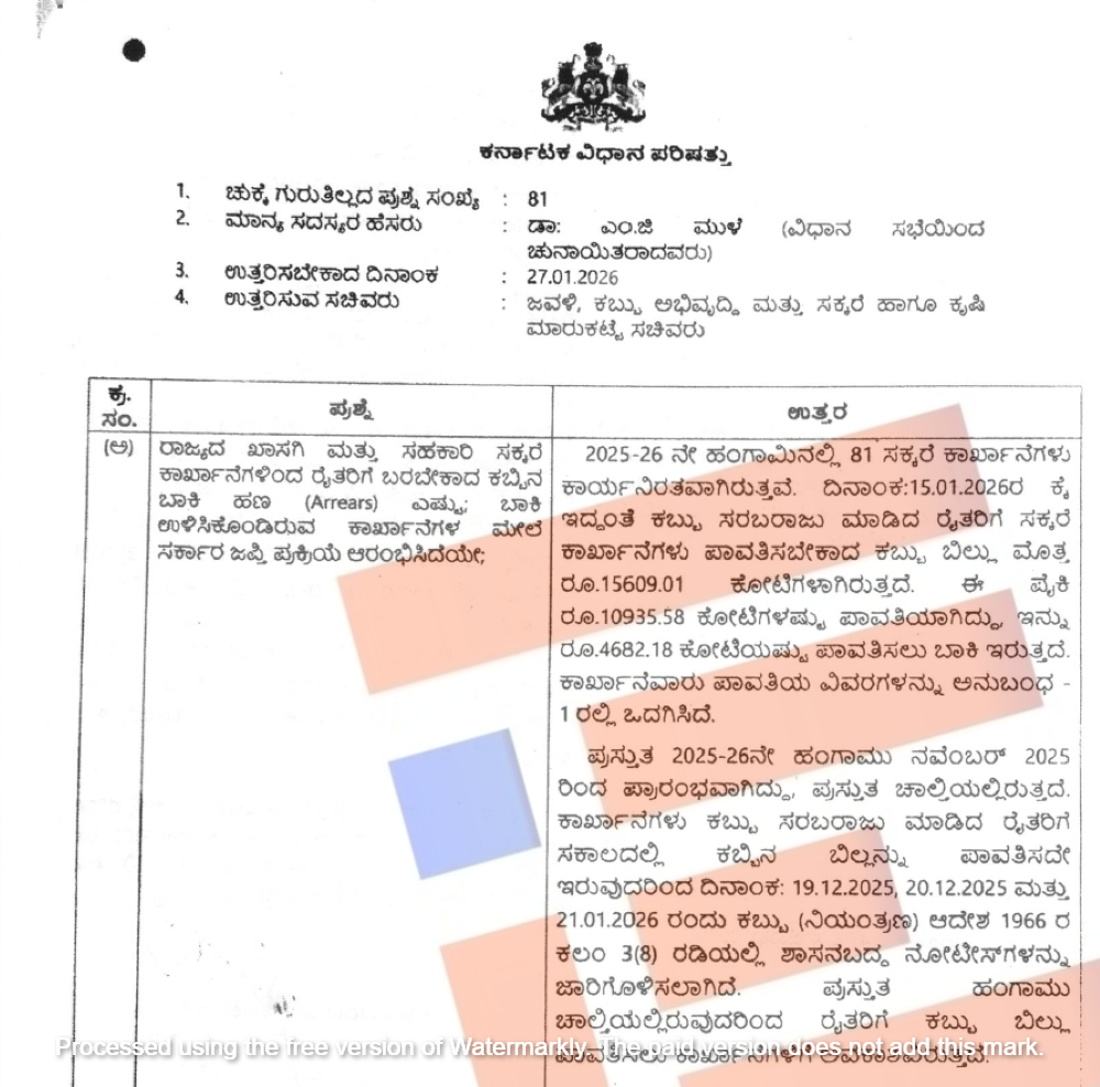 2025-26ನೇ ಹಂಗಾಮಿನಲ್ಲಿ 81 ಸಕ್ಕರೆ ಕಾರ್ಖಾನೆಗಳು ಕಾರ್ಯನಿರತವಾಗಿದೆ. 2026ರ ಜನವರಿ 15ಕ್ಕೆ ಕಬ್ಬು ಸರಬರಾಜು ಮಾಡಿದ ರೈತರಿಗೆ ಸಕ್ಕರೆ ಕಾರ್ಖಾನೆಗಳು ಪಾವತಿಸಬೇಕಾದ ಕಬ್ಬು ಬಿಲ್ ಮೊತ್ತ 16,609.01 ಕೋಟಿಗಳಾಗಿವೆ. ಈ ಪೈಕಿ 10,935.58 ಕೋಟಿ ರು.ಗಳು ಪಾವತಿಯಾಗಿದೆ. ಇನ್ನೂ 4,682.8 ಕೋಟಿ ಪಾವತಿಸಲು ಬಾಕಿ ಇದೆ ಎಂದು ಸಚಿವ ಶಿವಾನಂದ ಪಾಟೀಲ್ ಅವರು ಉತ್ತರಿಸಿದ್ದಾರೆ.
