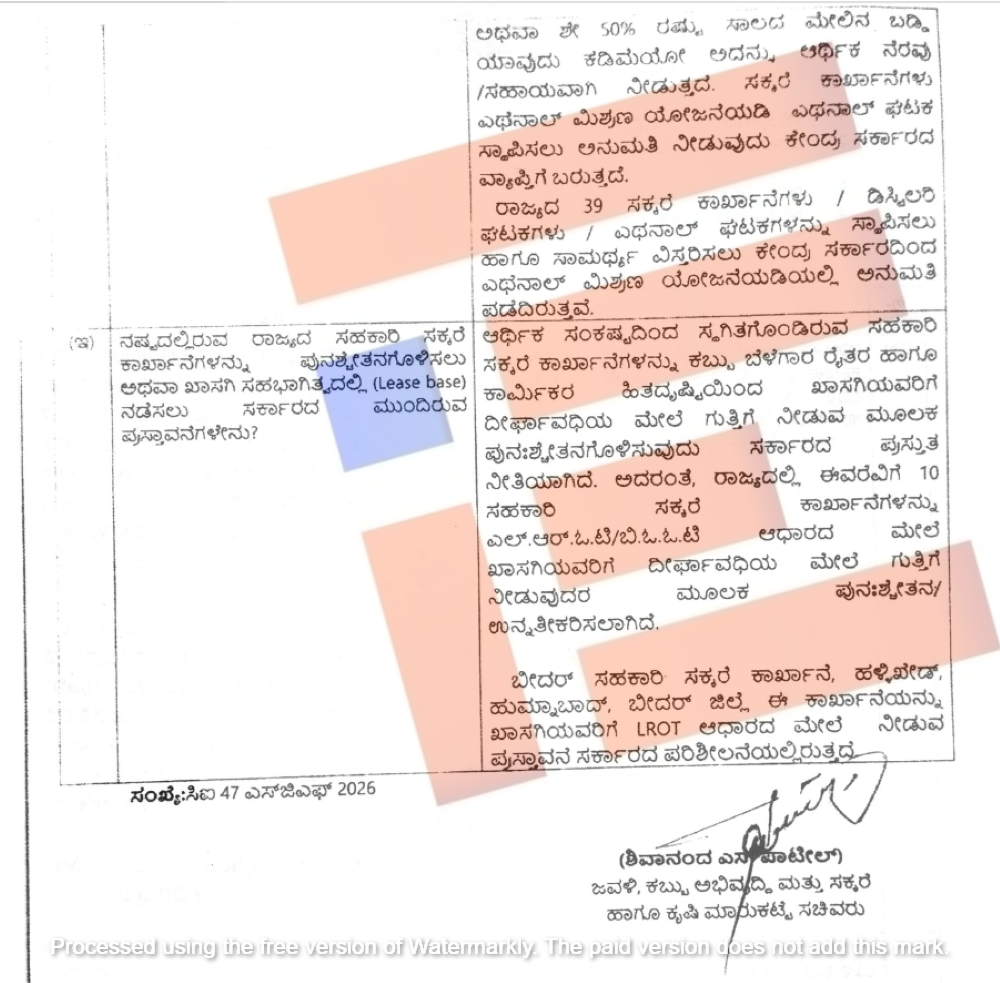 ಆರ್ಥಿಕ ಸಂಕಷ್ಟದಿಂದ ಸ್ಥಗಿತಗೊಂಡಿರುವ ಸಹಕಾರಿ ಸಕ್ಕರೆ ಕಾರ್ಖಾನೆಗಳನ್ನು ಕಬ್ಬು ಬೆಳೆಗಾರ ರೈತರ ಹಾಗೂ ಕಾರ್ಮಿಕರ ಹಿತದೃಷ್ಟಿಯಿಂದ ಖಾಸಗಿಯವರಿಗೆ ದೀರ್ಘಾವಧಿ ಗುತ್ತಿಗೆ ನೀಡಲಾಗುತ್ತಿದೆ. ರಾಜ್ಯದಲ್ಲಿ ಇದುವರೆಗೆ 10 ಸಹಕಾರಿ ಸಕ್ಕರೆ ಸಕ್ಕರೆ ಕಾರ್ಖಾನೆಗಳನ್ನು ಎಲ್‌ಆರ್‍‌ಒಟಿ, ಬಿಓಒಟಿ ಆಧಾರದ ಮೇಲೆ ಖಾಸಗಿಯವರಿಗೆ ದೀರ್ಘಾವಧಿ ಗುತ್ತಿಗೆ ನೀಡಿ ಪುನಶ್ಚೇತನಗೊಳಿಸಲಾಗಿದೆ ಎಂದು ಉತ್ತರಿಸಿದ್ದಾರೆ.