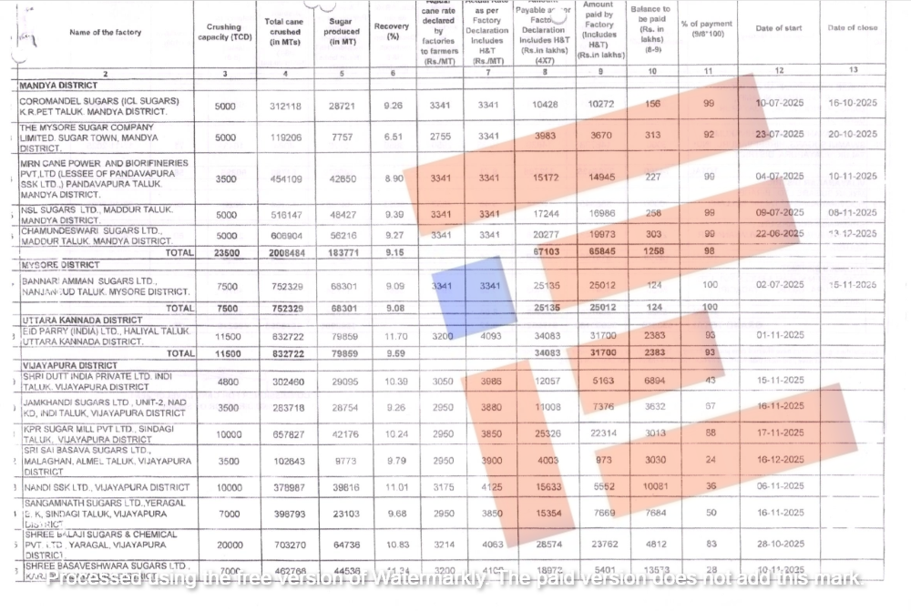 ಪ್ರಸ್ತುತ 2025-26ನೇ ಹಂಗಾಮು ನವೆಂಬರ್‍‌ 2025ರಿಂದ ಪ್ರಾರಂಭವಾಗಿದೆ. ಇದು ಪ್ರಸ್ತುತ ಚಾಲ್ತಿಯಲ್ಲಿರುತ್ತದೆ. ಕಾರ್ಖಾನೆಗಳು ಕಬ್ಬು ಸರಬರಾಜು ಮಾಡಿದ ರೈತರಿಗೆ ಸಕಾಲದಲ್ಲಿ ಕಬ್ಬಿನ ಬಿಲ್‌ನ್ನು ಪಾವತಿಸದೇ ಇರುವುದರಿಂದ 2025ರ ಡಿಸೆಂಬರ್‍‌ 19ರಿಂದ 20 ಮತ್ತು 2026ರ ಜನವರಿ 21ರಂದು ಕಬ್ಬು (ನಿಯಂತ್ರಣ ) ಆದೇಶ 1966ರ ಕಲಂ 3(8)ರ ಅಡಿಯಲ್ಲಿ ಶಾಸನಬದ್ಧ ನೋಟೀಸ್‌ ಜಾರಿಗೊಳಿಸಿದೆ. ಪ್ರಸ್ತುತ ಹಂಗಾಮು ಚಾಲ್ತಿಯಲ್ಲಿರುವುದರಿಂದ ರೈತರಿಗೆ ಕಬ್ಬು ಬಿಲ್‌ ಪಾವತಿಸಲು ಕಾರ್ಖಾನೆಗಳಿಗೆ ಅವಕಾಶವಿದೆ ಎಂದು ಸಚಿವರು ಮಾಹಿತಿ ನೀಡಿದ್ದಾರೆ.