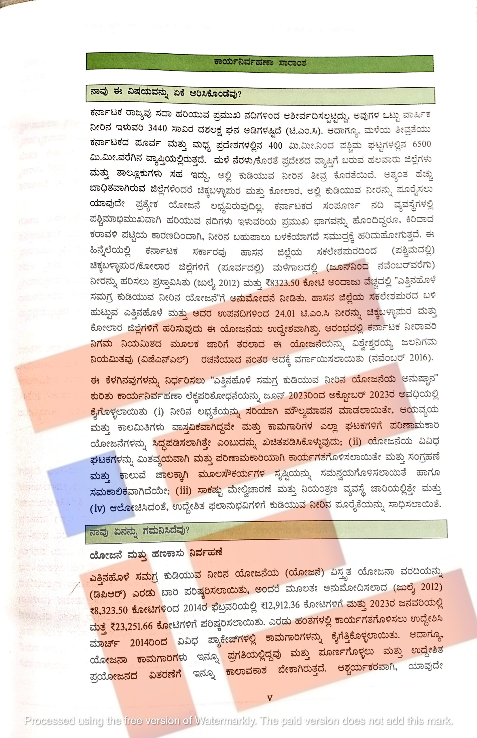 ಎತ್ತಿನಹೊಳೆ ಸಮಗ್ರ ಕುಡಿಯುವ ನೀರಿನ ಯೋಜನೆಯ ವಿಸ್ತೃತ ಯೋಜನಾ ವರದಿಯನ್ನು ಎರಡು ಬಾರಿ ಪರಿಷ್ಕರಿಸಲಾಗಿದೆ. 2012ರಲ್ಲಿ ಅನುಮೋದಿಸಿದ್ದ ಮೂಲ ಯೋಜನೆ ಮೊತ್ತ 8,323.50 ಕೊಟಿ ಗಳಿಂದ 2014ರ ಫೆಬ್ರುವರಿಯಲ್ಲಿ 12,912.36 ಕೊಟಿ ರುಗೆ, 2023ರ ಜನವರಿಯಲ್ಲಿ 23,251.66 ಕೋಟಿ ರು ಗಳಿಗೆ ಪರಿಷ್ಕರಿಸಲಾಗಿದೆ. ಎರಡು ಹಂತಗಳಲ್ಲಿ ಕಾರ್ಯಗತಗೊಳಿಸಲು ಉದ್ದೇಶಿಸಿದ್ದ ನಿಗಮವು, 2014ರ ಮಾರ್ಚ್‌ನಿಂದ ವಿವಿಧ ಪ್ಯಾಕೇಜ್‌ಗಳಲ್ಲಿ ಕಾಮಗಾರಿಗಳನ್ನು ಕೈಗೆತ್ತಿಕೊಂಡಿತ್ತು. ಆದರೂ ಸಹ ಯೋಜನಾ ಕಾಮಗಾರಿಗಳು ಇನ್ನೂ ಪ್ರಗತಿಯಲ್ಲಿವೆ. ಮತ್ತು ಪೂರ್ಣಗೊಳ್ಳಲು ಹಾಗೂ ಉದ್ದೇಶಿತ ಯೋಜನೆಯ ಪ್ರಯೋಜನ ಆಗಬೇಕಾದರೆ ಇನ್ನೂ ಕಾಲಾವಕಾಶ ಬೇಕಿದೆ ಎಂದು ವರದಿ ಹೇಳಿದೆ.