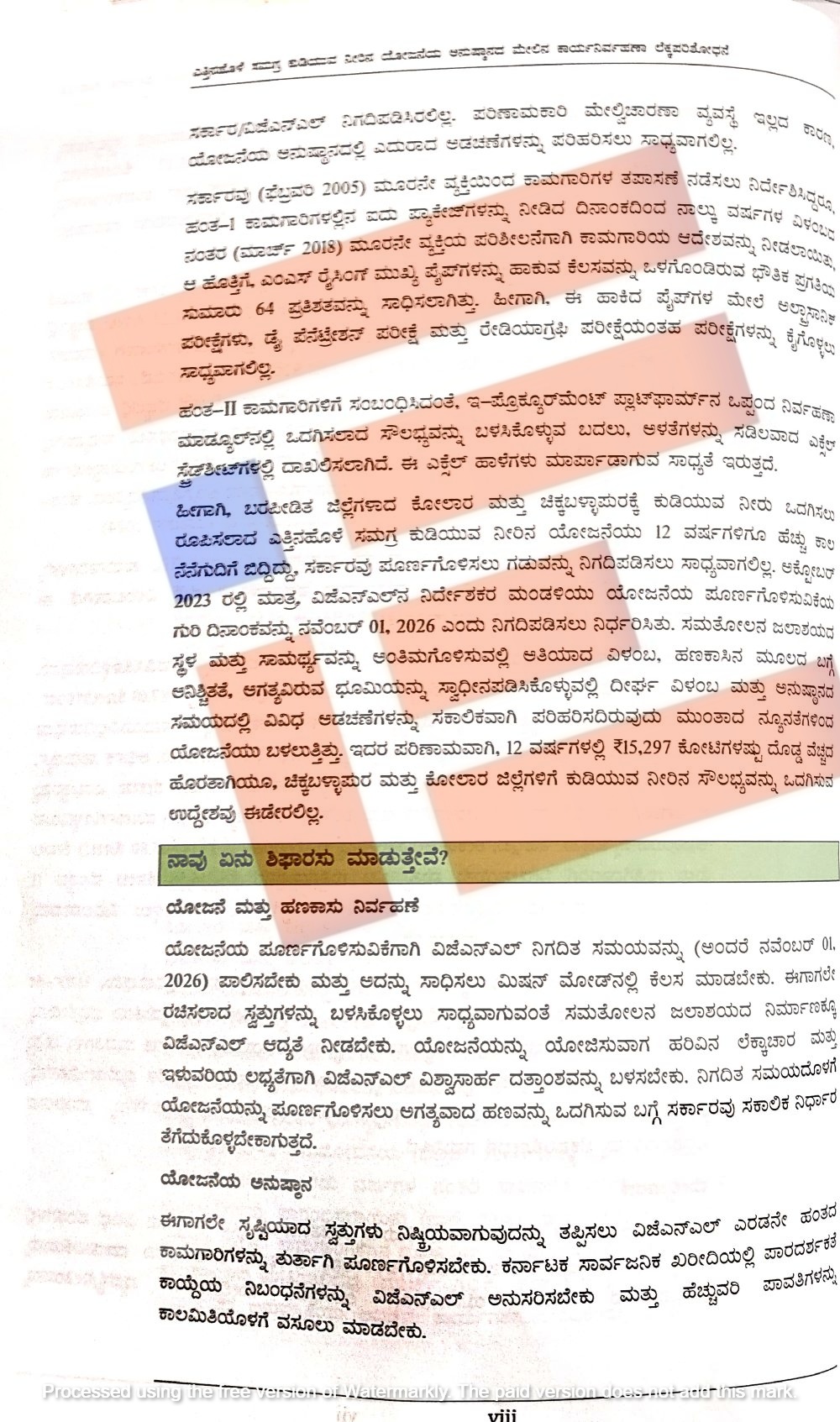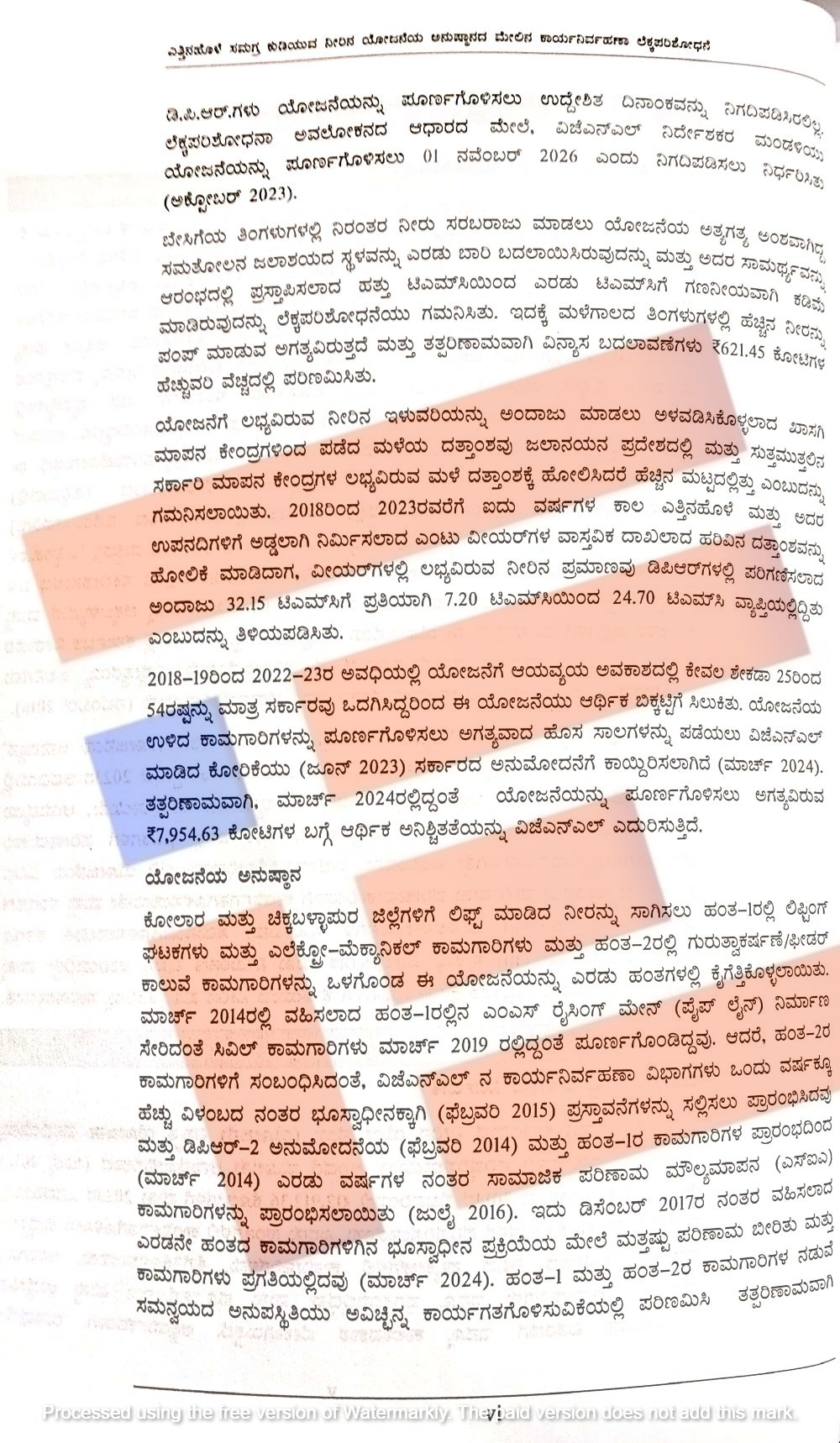 2018-19ರಿಂದ 2022-23ರ ಅವಧಿಯಲ್ಲಿ ಯೋಜನೆಗೆ ಆಯವ್ಯಯ ಅವಕಾಶದಲ್ಲಿ ಕೇವಲ ಶೆ. 25ರಿಂದ 54ರಷ್ಟನ್ನು ಮಾತ್ರ ಸರ್ಕಾರವು ಅನುದಾನ ಒದಗಿಸಿದೆ. ಹೀಗಾಗಿ ಈ ಯೋಜನೆಯು ಆರ್ಥಿಕ ಬಿಕ್ಕಟ್ಟಿಗೆ ಸಿಲುಕಿತು. ಯೋಜನೆಯ ಉಳಿದ ಕಾಮಗಾರಿಗಳನ್ನು ಪೂರ್ಣಗೊಳಿಸಲು ಅಗತ್ಯವಾದ ಹೊಸ ಸಾಲ ಪಡೆಯಲು ವಿಜೆಎನ್‌ಎಲ್‌ ಕೋರಿತ್ತು. 2024ರ ಮಾರ್ಚ್‌ವರೆಗೆ ಸರ್ಕಾರದ ಅನುಮೋದನೆಗೆ ಕಾಯ್ದಿರಿಸಲಾಗಿತ್ತು. ಹೀಗಾಗಿ 2024ರ ಮಾರ್ಚ್‌ನಲ್ಲಿದ್ದಂತೆ ಈ ಯೋಜನೆಯು ಪೂರ್ಣಗೊಳಿಸಲು ಅಗತ್ಯವಿರುವ 7,954.63 ಕೋಟಿ ರು.ಗಳ ಬಗ್ಗೆ ನಿಗಮವು  ಆರ್ಥಿಕ ಅನಿ‍ಶ್ಚತೆಯಲ್ಲಿದೆ ಎಂದು ಸಿಎಜಿ ವರದಿಯಲ್ಲಿ ವಿವರಿಸಿದೆ.