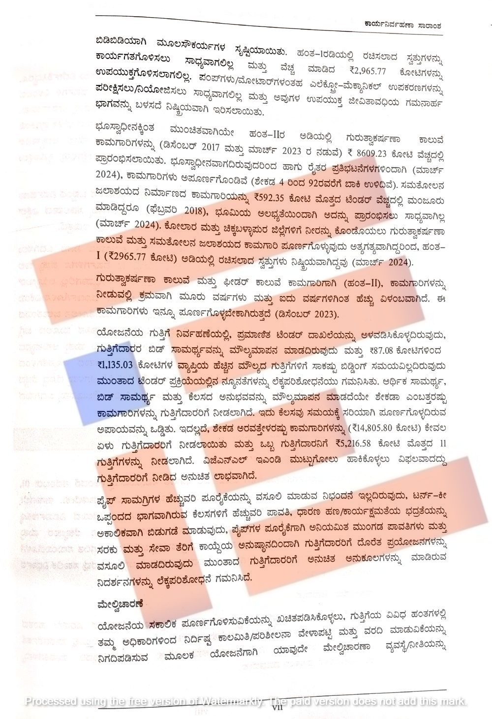 ಯೋಜನೆ ಗುತ್ತಿಗೆ ನಿರ್ವಹಣೆಯಲ್ಲಿ ನಿಗಮವು ಪ್ರಮಾಣಿತ ಟೆಂಡರ್‍‌ ದಾಖಲೆಯನ್ನೇ ಅಳವಡಿಸಿಕೊಂಡಿರಲಿಲ್ಲ. ಗುತ್ತಿಗೆದಾರರ ಬಿಡ್‌ ಸಾಮರ್ಥ್ಯವನ್ನೂ ಮೌಲ್ಯಮಾಪನ ಮಾಡಿರಲಿಲ್ಲ. ಅಲ್ಲದೇ 87.08 ಕೋಟಿ ರುಗಳಿಂದ 1,135.03 ಕೋಟಿ ರು. ವ್ಯಾಪ್ತಿಯ ಹೆಚ್ಚಿನ ಮೌಲ್ಯದ ಗುತ್ತಿಗೆಗಳಿಗೆ ಸಾಕಷ್ಟು ಬಿಡ್ಡಿಂಗ್‌ ಸಮಯವೇ ಇರಲಿಲ್ಲ. ಇಂತಹ ಹತ್ತಾರು ನ್ಯೂನತೆಗಳನ್ನು ಸಿಎಜಿಯು ಪತ್ತೆ ಹಚ್ಚಿದೆ.