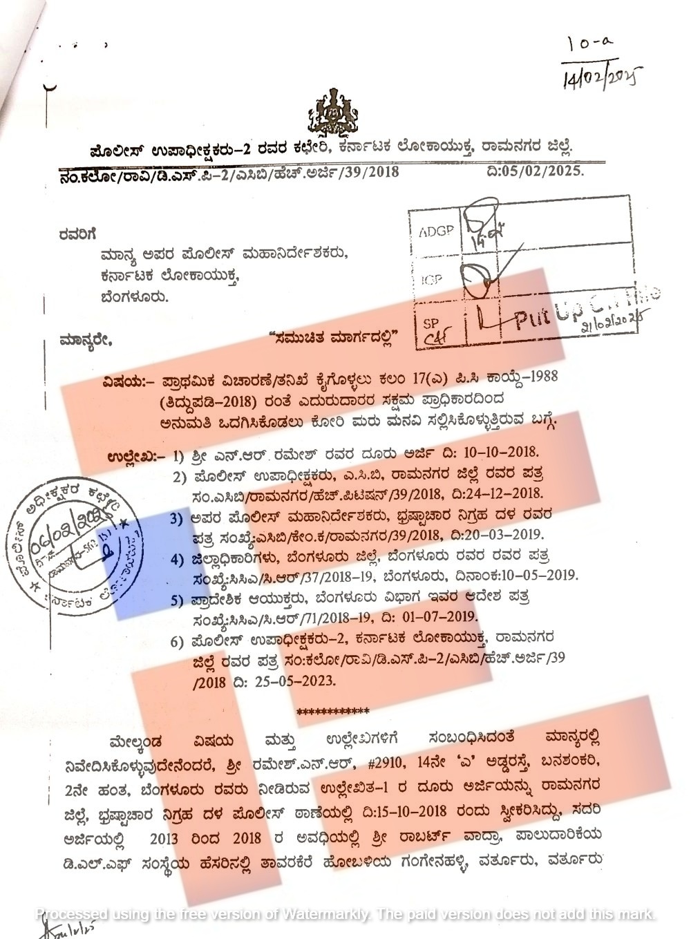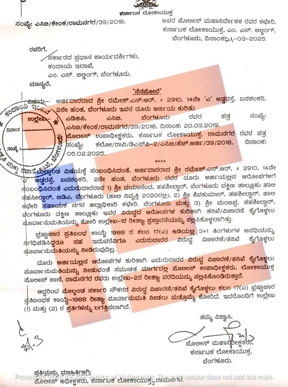ಇದಾದ ನಂತರ ಲೋಕಾಯುಕ್ತದ ರಾಮನಗರ ಡಿವೈಎಸ್ಪಿ, ಎದುರುದಾರರ ವಿರುದ್ಧ ಪ್ರಾಥಮಿಕ ವಿಚಾರಣೆ, ತನಿಖೆ ಕೈಗೊಳ್ಳಲು ಭ್ರಷ್ಟಾಚಾರ ಕಾಯ್ದೆ 1988ರ (ತಿದ್ದುಪಡಿ 2018ರಂತೆ) ಕಲಂ 17(ಎ) ಅಡಿಯಲ್ಲಿ ಸಕ್ಷಮ ಪ್ರಾಧಿಕಾರದಿಂದ ಅನುಮತಿ ಒದಗಿಸಿಕೊಡಬೇಕು ಎಂದು ಮರು ಮನವಿ ಮಾಡಿದ್ದರು.