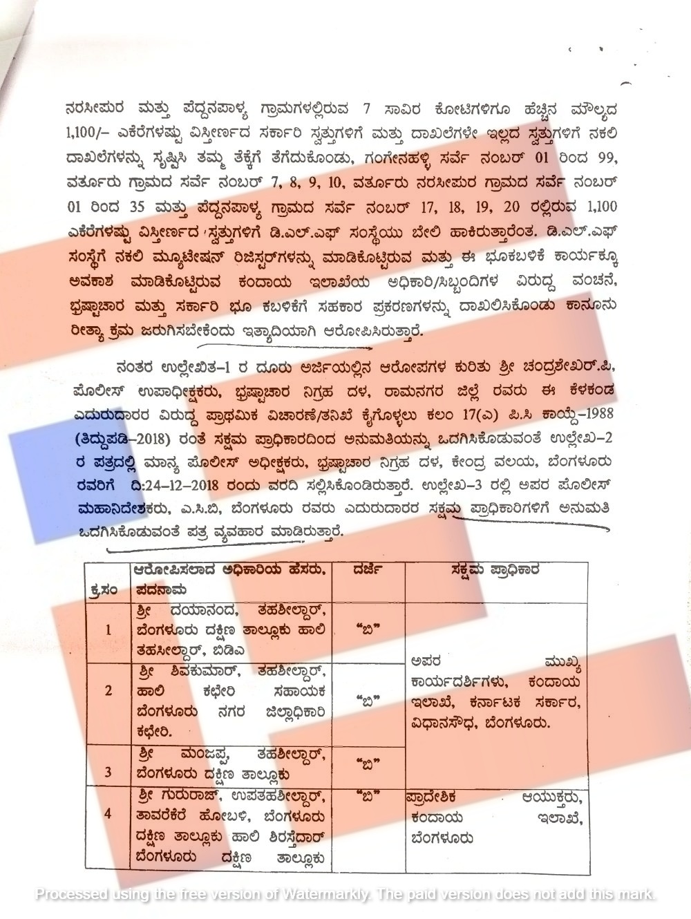 ಈ ಪೈಕಿ ಬೆಂಗಳೂರು ನಗರ ಜಿಲ್ಲಾಧಿಕಾರಿಗಳು ಕಂದಾಯ ನಿರೀಕ್ಷಕರಾದ ರವಿಕುಮಾರ್, ಗ್ರಾಮ ಲೆಕ್ಕಿಗರಾದ ಅಂಜನ್, ವಿಜಯಕುಮಾರ್ ಅವರ ವಿರುದ್ಧ ಪ್ರಾಥಮಿಕ ವಿಚಾರಣೆ ಕೈಗೊಳ್ಳಲು ಅನುಮತಿ ನೀಡಿದ್ದರು. ಅಲ್ಲದೇ ಬೆಂಗಳೂರು ವಿಭಾಗದ ಪ್ರಾದೇಶಿಕ ಆಯುಕ್ತರು, ತಾವರೆಕೆರೆ ಹೋಬಳಿಯ ಹಿಂದಿನ ಉಪ ತಹಶೀಲ್ದಾರ್ ಗುರುರಾಜ್ ಅವರ ವಿರುದ್ಧ ಪ್ರಾಥಮಿಕ ವಿಚಾರಣೆ ಕೈಗೊಳ್ಳಲು ಅನುಮತಿ ನೀಡಿದ್ದರು. ನಂತರ ಈ ದೂರರ್ಜಿಯ ವಿಚಾರಣೆಯು ಎಸಿಬಿಯಿಂದ ಲೋಕಾಯುಕ್ತದ ರಾಮನಗರ ಠಾಣೆಗೆ ವರ್ಗಾವಣೆಗೊಂಡಿತ್ತು.