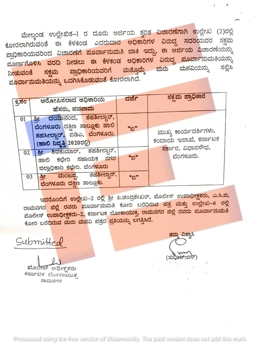 ಈ ಅರ್ಜಿಯ ವಿಚಾರಣೆಯನ್ನು ಪೂರ್ಣಗೊಳಿಸಿ ವರದಿ ನೀಡಲು ತಹಸೀಲ್ದಾರ್ ದಯಾನಂದ, ಶಿವಕುಮಾರ್, ಮಂಜಪ್ಪ ಅವರ ವಿರುದ್ಧ ವಿಚಾರಣೆ ನಡೆಸಲು ಪೂರ್ವಾನುಮತಿ ನೀಡಬೇಕು ಎಂದು 2025ರ ಫೆ.5ರಂದು ರಾಮನಗರ ಲೋಕಾಯುಕ್ತ ಎಸ್ಪಿ ಎಸ್ ಸುಧೀರ್ ಅವರು ಮರು ಮನವಿ ಸಲ್ಲಿಸಿದ್ದರು.