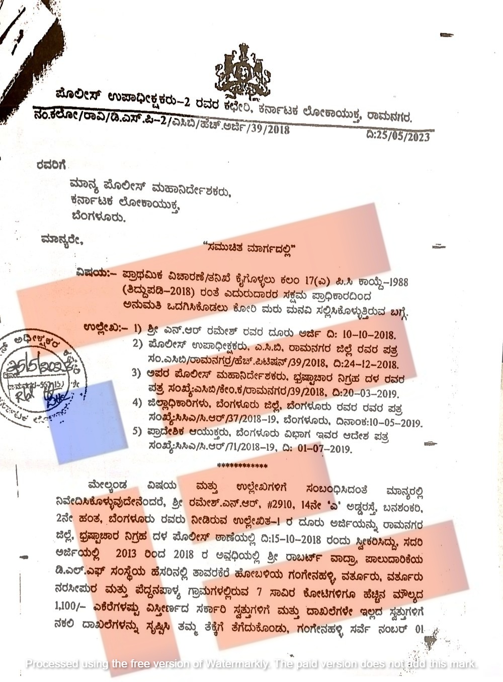 ರಾಬರ್ಟ್ ವಾದ್ರಾ ಪಾಲುದಾರಿಕೆಯ ಡಿಎಲ್ಎಫ್ ಸಂಸ್ಥೆಯು 10,000 ಕೋಟಿ ರುಪಾಯಿ ಬೆಲೆಬಾಳುವ 1,100 ಎಕರೆ ವಿಸ್ತೀರ್ಣದ ಸರ್ಕಾರಿ ಜಮೀನುಗಳನ್ನು ಕಬಳಿಸಿದೆ ಎಂದು ಬೆಂಗಳೂರು ದಕ್ಷಿಣ ಜಿಲ್ಲಾ ಬಿಜೆಪಿ ಘಟಕದ ರಮೇಶ್ ಎನ್ ಆರ್ ಅವರು ಲೋಕಾಯುಕ್ತಕ್ಕೆ ದೂರು ಸಲ್ಲಿಸಿದ್ದರು. ಈ ದೂರರ್ಜಿಯಲ್ಲಿನ ಆರೋಪಗಳ ಕುರಿತು ಪ್ರಾಥಮಿಕ ವಿಚಾರಣೆ ನಡೆಸಲು ಲೋಕಾಯುಕ್ತದ ರಾಮನಗರ ಜಿಲ್ಲಾ ಡಿವೈಎಸ್ಪಿ ಅವರು ಲೋಕಾಯುಕ್ತದ ಎಡಿಜಿಪಿ ಅವರಿಗೆ 2023ರ ಮೇ 25ರಂದು ಪತ್ರ ಬರೆದಿದ್ದರು.