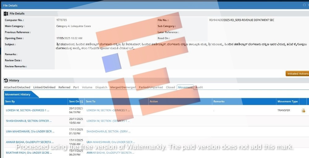 ಲೋಕಾಯುಕ್ತ ಮತ್ತು ಕಂದಾಯ ಇಲಾಖೆಯ ನಡುವೆ ಪತ್ರ ವ್ಯವಹಾರಗಳಲ್ಲಿಯೇ ಕಾಲಹರಣವಾಗಿದೆ. ಸದ್ಯ ಈ ಕಡತವು 2025ರ ಡಿಸೆಂಬರ್ 20ರಂದು ಕಂದಾಯ ಇಲಾಖೆಯ ವಿಭಾಗದ ಲಾಗಿನ್ನಲ್ಲಿರುವುದು ಗೊತ್ತಾಗಿದೆ.