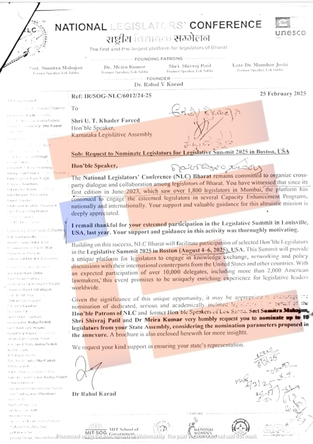 ಬೋಸ್ಟನ್ ಶೃಂಗಸಭೆಯಲ್ಲಿ ಪಾಲ್ಗೊಳ್ಳುವಿಕೆಗೆ ಸಂಬಂಧಿಸಿದಂತೆ ಸಮ್ಮೇಳನ ಅಧ್ಯಕ್ಷ ಡಾ ರಾಹುಲ್ ಕರಾದ್ ಅವರು ವಿಧಾನಸಭೆಯ 10 ಸದಸ್ಯರನ್ನು ನಾಮನಿರ್ದೇಶನಗೊಳಿಸಬೇಕು ಎಂದು ಸ್ಪೀಕರ್ ಯು ಟಿ ಖಾದರ್ ಅವರಿಗೆ 2025ರ ಫೆ.25ರಂದು ಪತ್ರ ಬರೆದಿದ್ದರು. ಅಲ್ಲದೇ ನಾಮನಿರ್ದೇಶನ ಮಾಡುವ ಮುನ್ನ ಹಲವು ಮಾನದಂಡಗಳ ಕುರಿತೂ ವಿವರಿಸಿದ್ದರು. ವಿಧಾನ ಪರಿಷತ್ ಸದಸ್ಯರೂ ಭಾಗವಹಿಸಲು ಸಭಾಪತಿ ಬಸವರಾಜ ಹೊರಟ್ಟಿ ಅವರೂ ಅನುಮತಿ ನೀಡಿದ್ದರು.