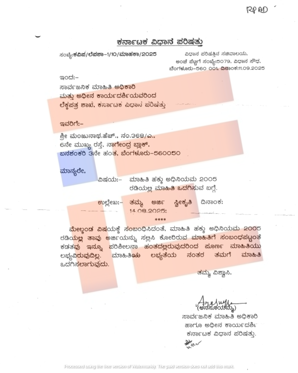 ವಿಧಾನಸಭೆ ಮತ್ತು ವಿಧಾನ ಪರಿಷತ್ ಸಚಿವಾಲಯವು 2025ರ ಅಕ್ಟೋಬರ್ 31ರಂದು ನೀಡಿರುವ ಮಾಹಿತಿಯು, ಹಿಂದಿನ ಮಾಹಿತಿಯನ್ನೇ ಪುನರುಚ್ಛರಿಸಿದೆ. ಸದಸ್ಯರು ಇನ್ನೂ ಬಿಲ್ ಸಲ್ಲಿಸಿಲ್ಲ ಎಂದೇ ಹೇಳಿದೆ.